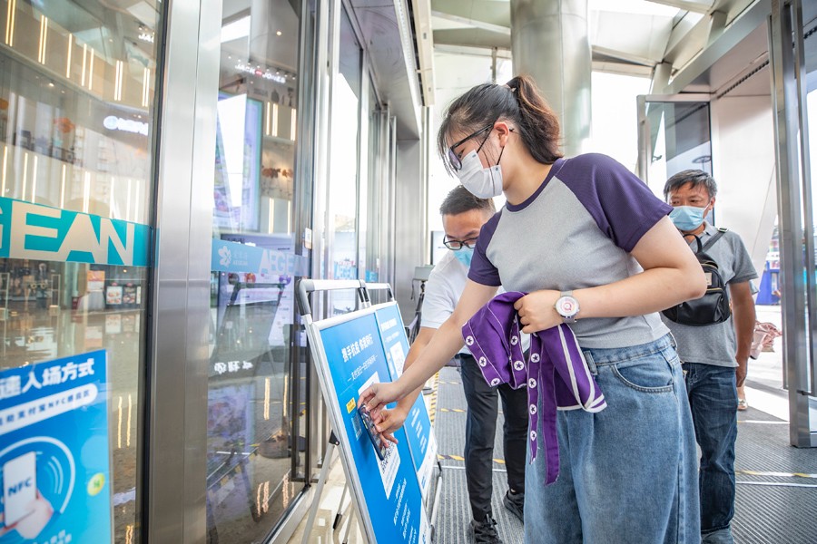 7月4日,在重慶兩江新區(qū)一購物公園內(nèi),顧客使用NFC功能完成入場登記。