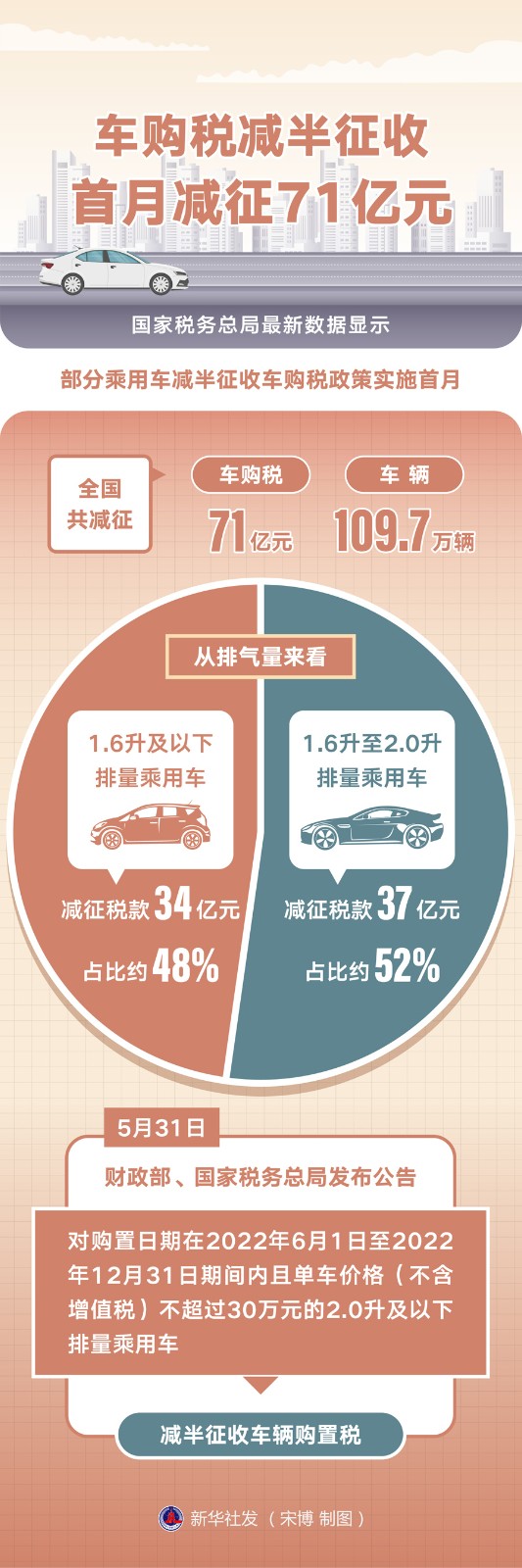 自6月1日起實施的部分乘用車減半征收車購稅政策已經“滿月”。國家稅務總局最新數據顯示,政策實施首月,全國共減征車購稅71億元,減征車輛109.7萬輛。從排氣量來看,1.6升及以下排量乘用車減征稅款34億元,占比約48%;1.6升至2.0升排量乘用車減征稅款37億元,占比約52%。