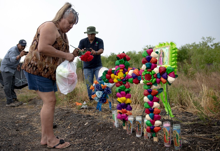 6月28日,一名女子在美國得克薩斯州圣安東尼奧市貨車慘案現場擺放塑料花束。