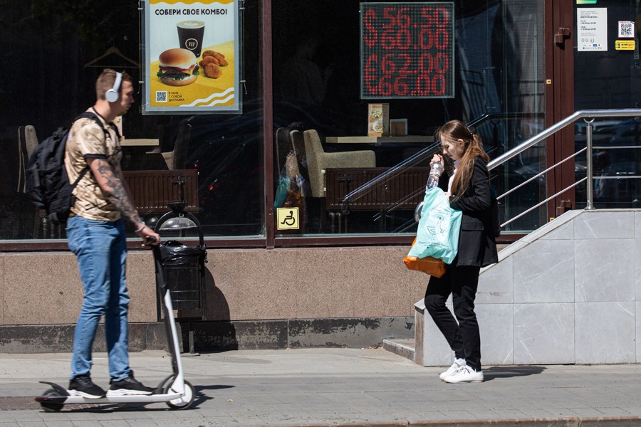 6月29日,在俄羅斯首都莫斯科,行人經(jīng)過一處外匯兌換點的匯率顯示屏。