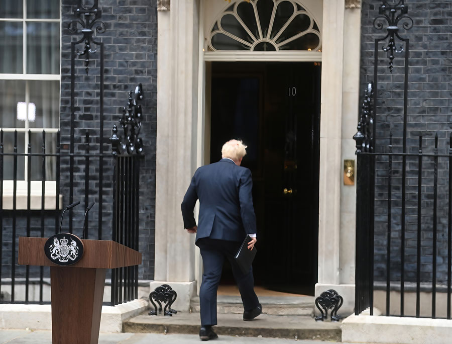 7月7日,英國首相鮑里斯·約翰遜在倫敦唐寧街10號門前發(fā)表講話后返回室內。