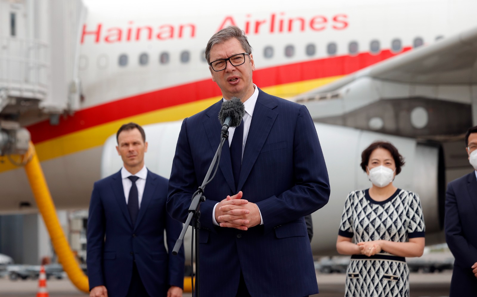 7月16日,在塞爾維亞貝爾格萊德機(jī)場,塞爾維亞總統(tǒng)武契奇在歡迎儀式上致辭。