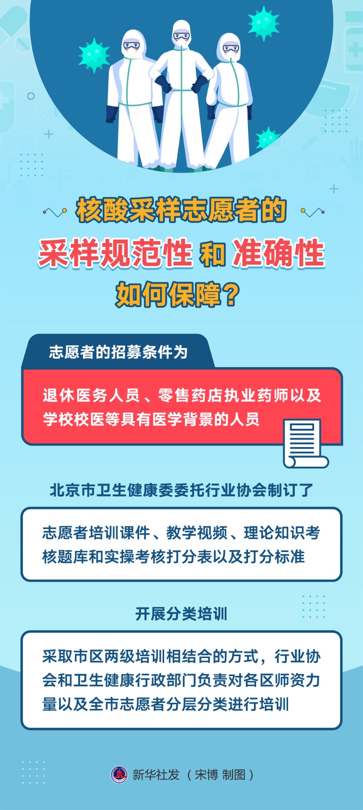 李昂表示,為確保志愿者采樣的規(guī)范性和準(zhǔn)確性,北京市衛(wèi)生健康委委托行業(yè)協(xié)會(huì)制訂了志愿者培訓(xùn)課件、教學(xué)視頻、理論知識(shí)考核題庫(kù)和實(shí)操考核打分表以及打分標(biāo)準(zhǔn),開展分類培訓(xùn),采取市區(qū)兩級(jí)培訓(xùn)相結(jié)合的方式,行業(yè)協(xié)會(huì)和衛(wèi)生健康行政部門負(fù)責(zé)對(duì)各區(qū)師資力量以及全市志愿者分層分類進(jìn)行培訓(xùn)。
