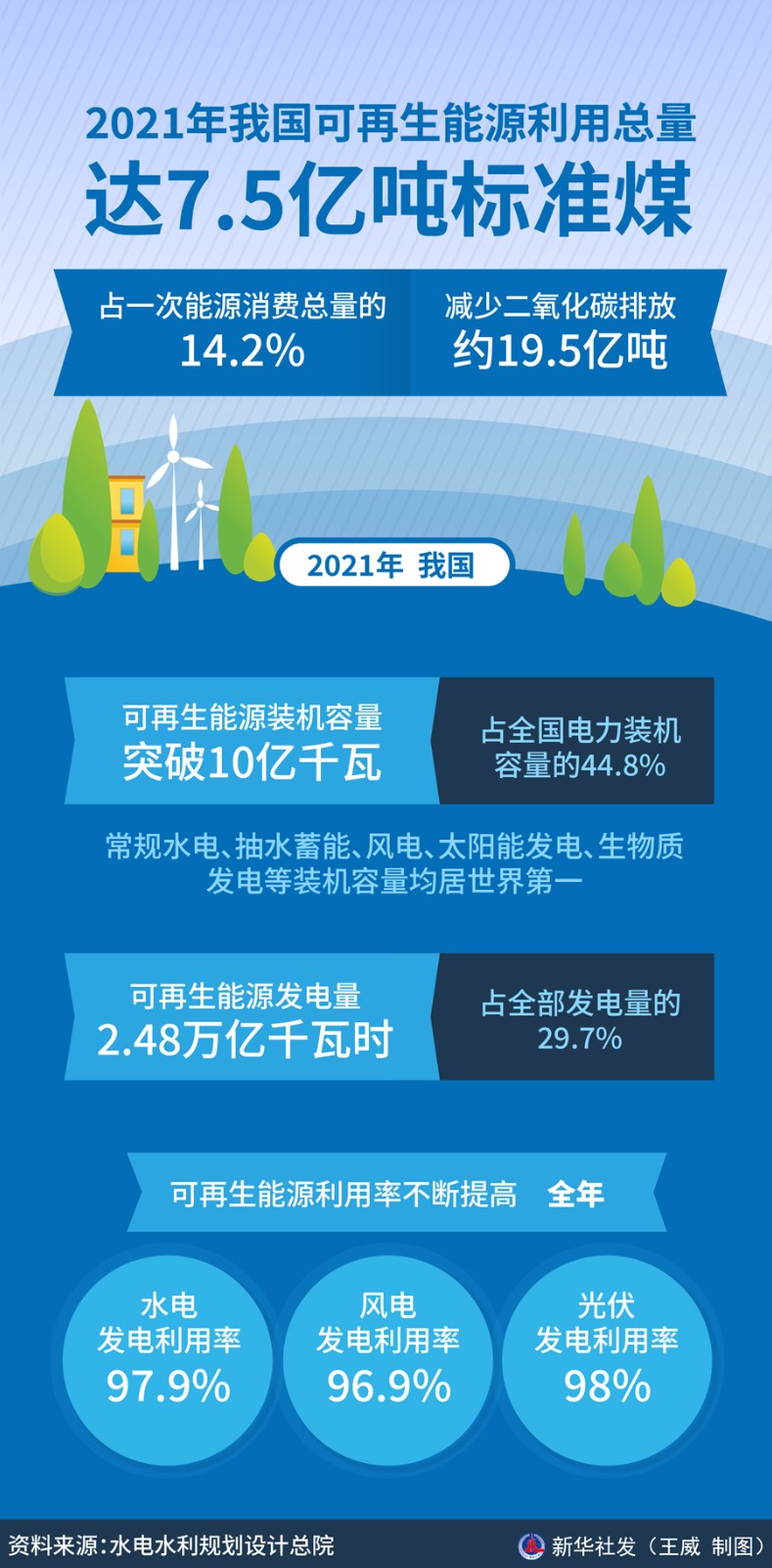2021年我國可再生能源利用總量達到7.5億噸標準煤,占一次能源消費總量的14.2%,減少二氧化碳排放約19.5億噸,為實現(xiàn)“雙碳”目標奠定了基礎。