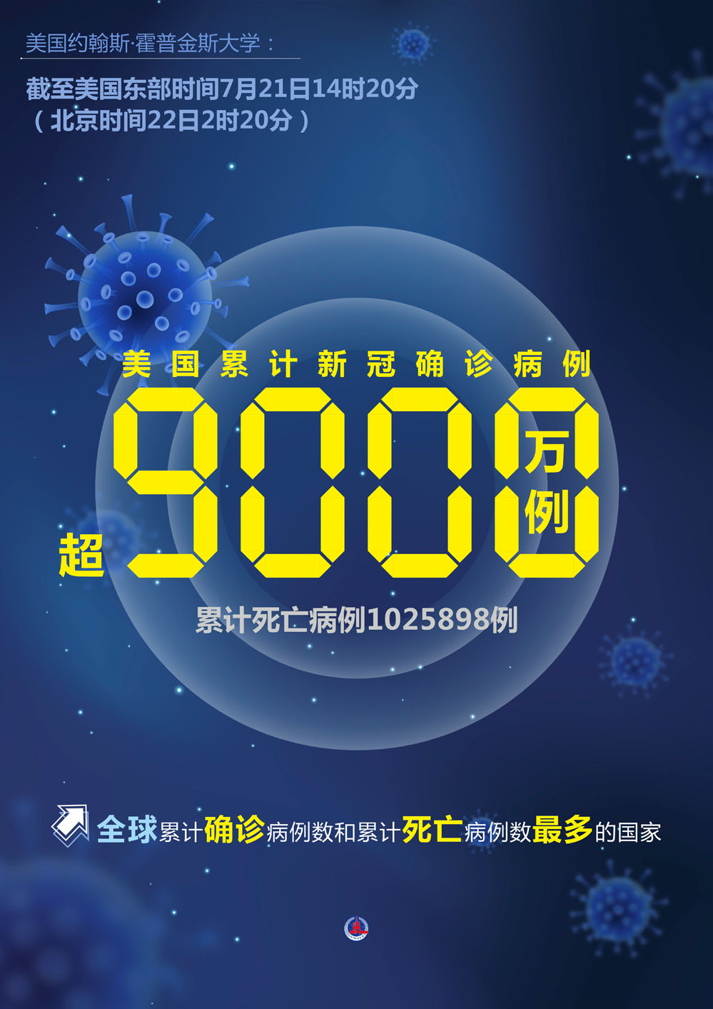 美國約翰斯·霍普金斯大學(xué)7月21日發(fā)布的新冠疫情最新統(tǒng)計(jì)數(shù)據(jù)顯示,美國累計(jì)確診病例超過9000萬例。