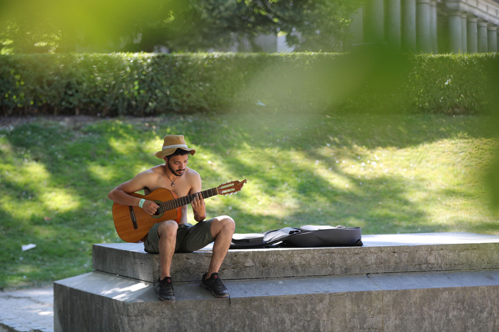 7月19日,一名男子在比利時(shí)布魯塞爾五十周年紀(jì)念公園的樹蔭下彈吉他。
