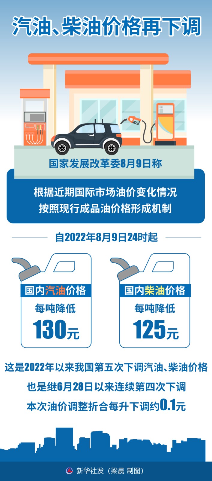 國家發(fā)展改革委8月9日稱,根據(jù)近期國際市場油價變化情況,按照現(xiàn)行成品油價格形成機制,自2022年8月9日24時起,國內(nèi)汽油、柴油價格每噸分別降低130元和125元。