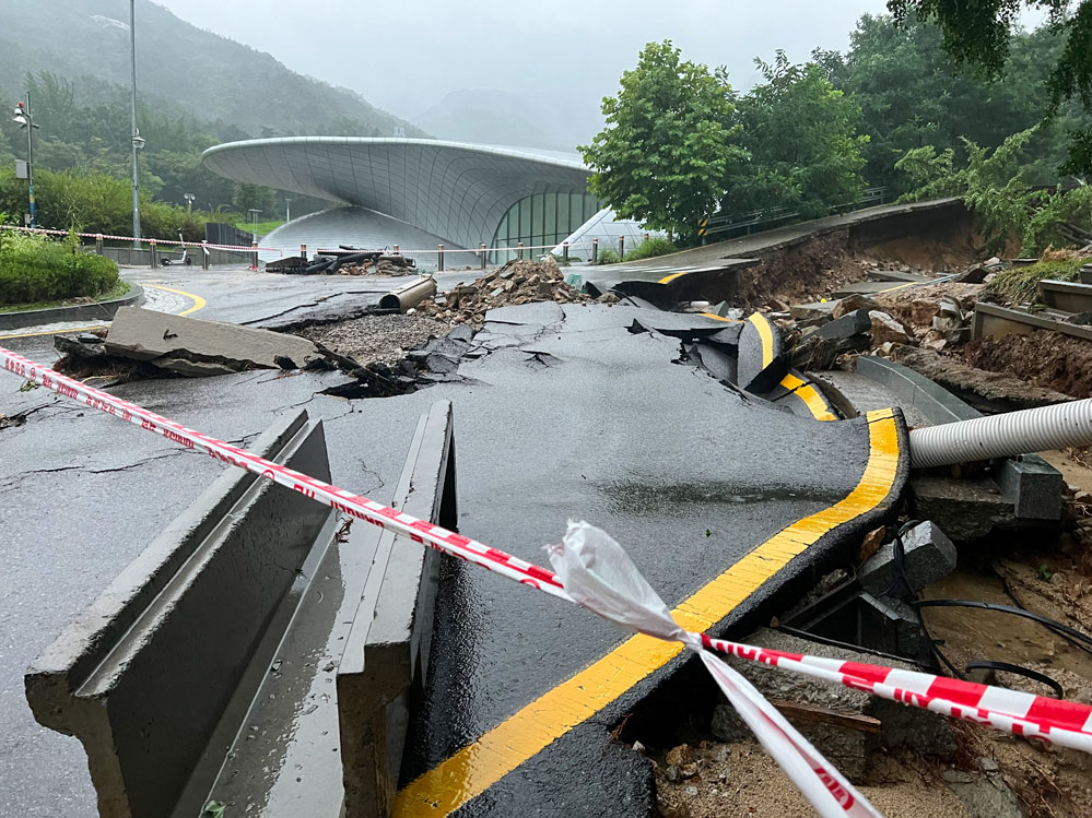 這是8月9日在韓國首爾大學拍攝的因遭遇強降雨而受損的道路(手機拍攝)。