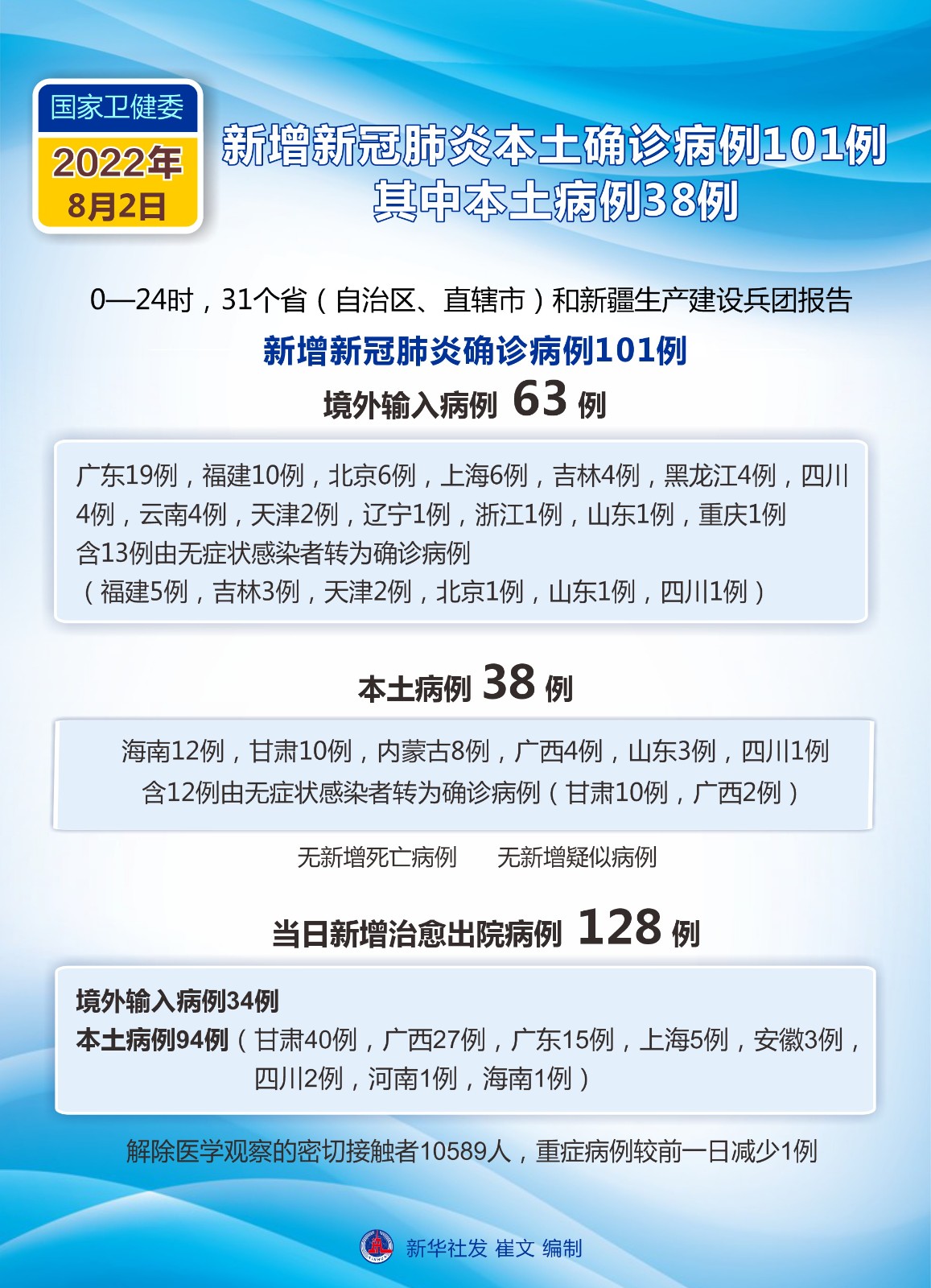 (圖表)國(guó)家衛(wèi)健委:8月2日新增新冠肺炎確診病例101例 其中本土病例38例