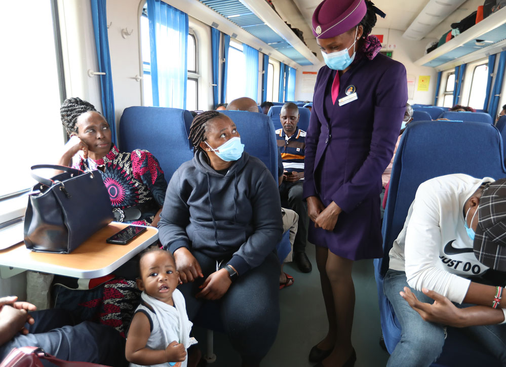 7月29日,列車員菲奧娜(站立者)在蒙內(nèi)鐵路客運列車上與乘客交流。