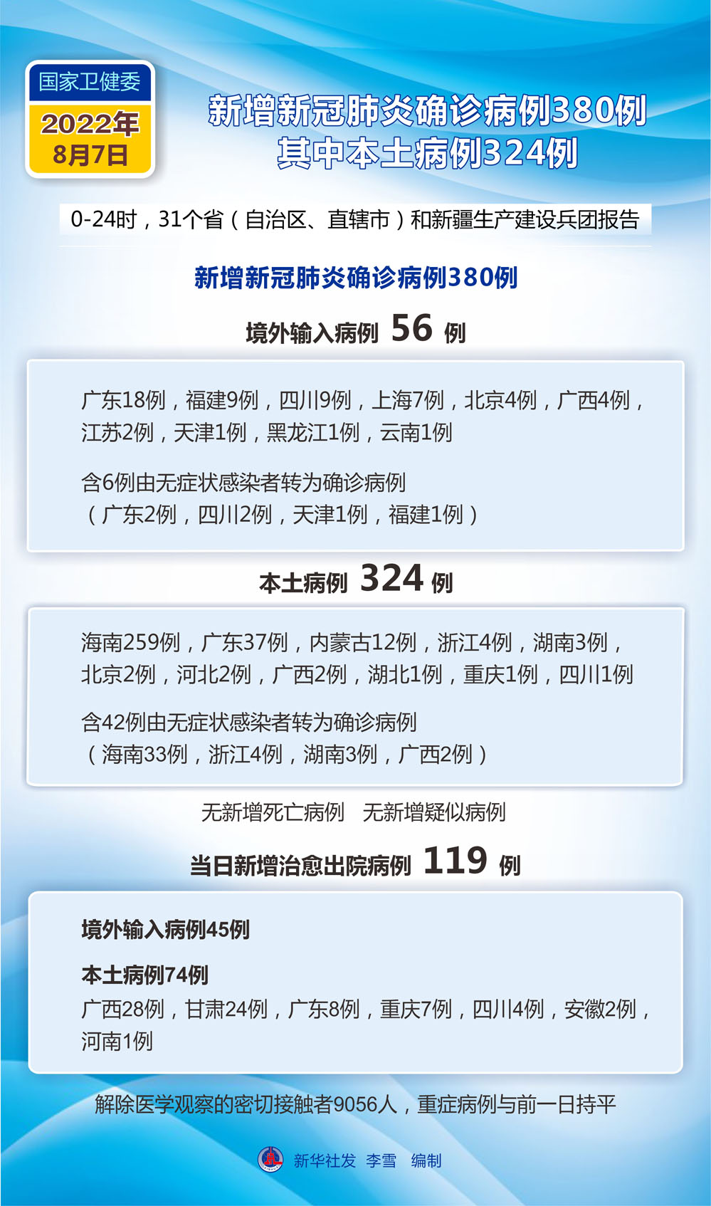(圖表)國(guó)家衛(wèi)健委:8月7日新增新冠肺炎確診病例380例 其中本土病例324例