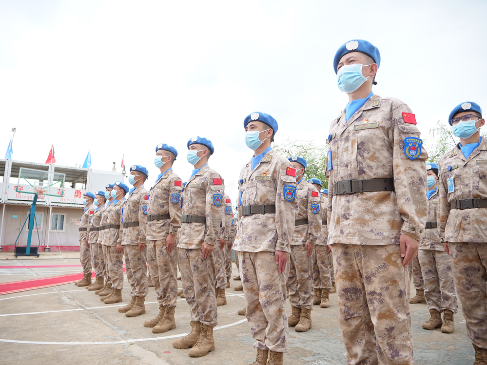 聯(lián)合國駐南蘇丹特派團(聯(lián)南蘇團)部隊司令喬杜里少將與朱巴戰(zhàn)區(qū)司令拉赫曼準將11日向中國赴南蘇丹(朱巴)維和步兵營105名官兵頒發(fā)“司令嘉獎”,以表彰他們在執(zhí)行聯(lián)合國維和任務(wù)中作出的杰出貢獻。