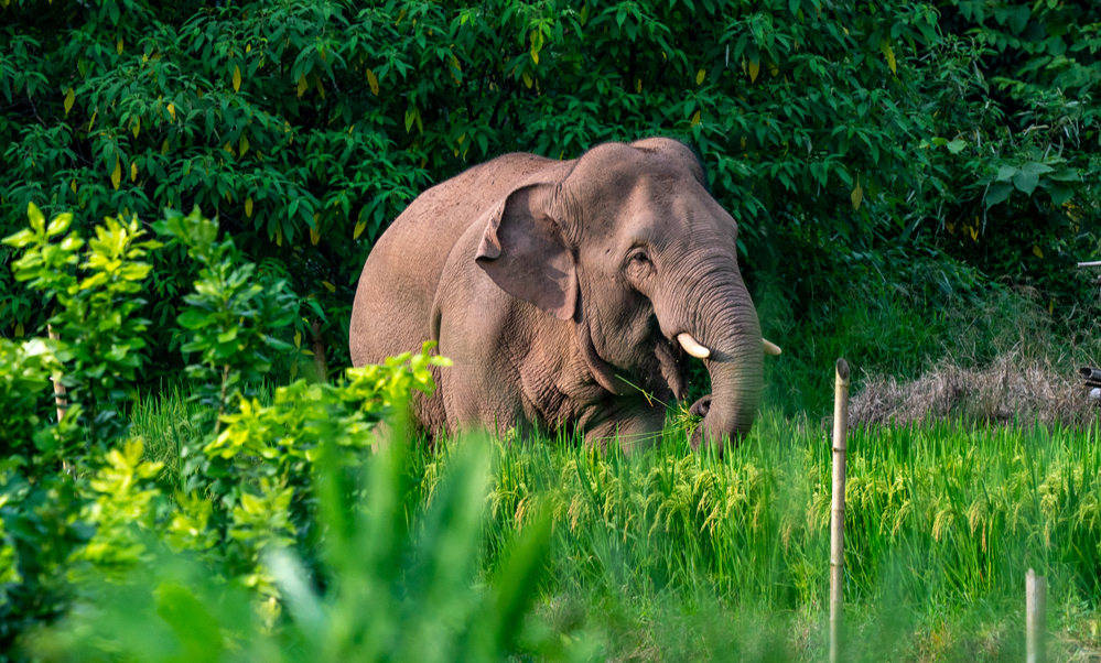 亞洲象在云南省普洱市江城哈尼族彝族自治縣一處村莊覓食(8月1日攝)。