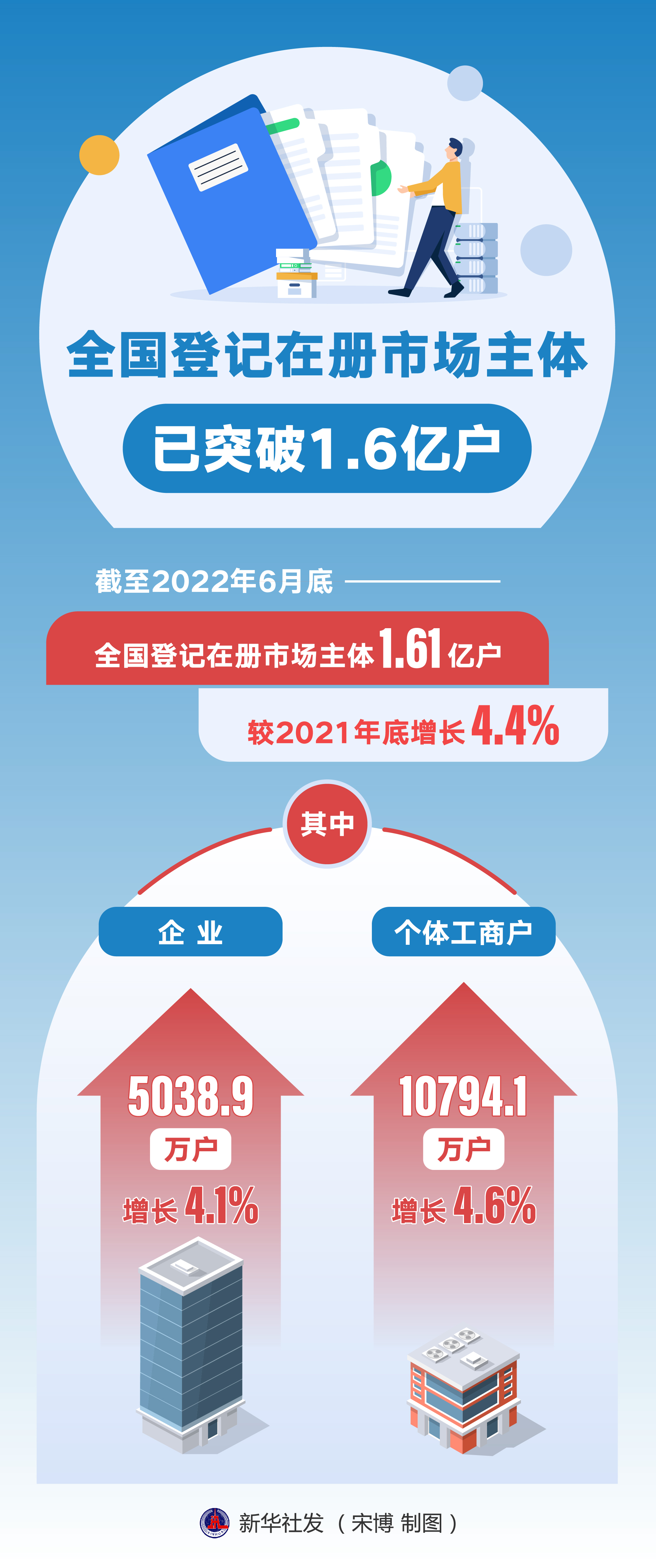 截至2022年6月底,全國登記在冊(cè)市場(chǎng)主體1.61億戶,較2021年底增長(zhǎng)4.4%。其中企業(yè)5038.9萬戶,增長(zhǎng)4.1%;個(gè)體工商戶10794.1萬戶,增長(zhǎng)4.6%。