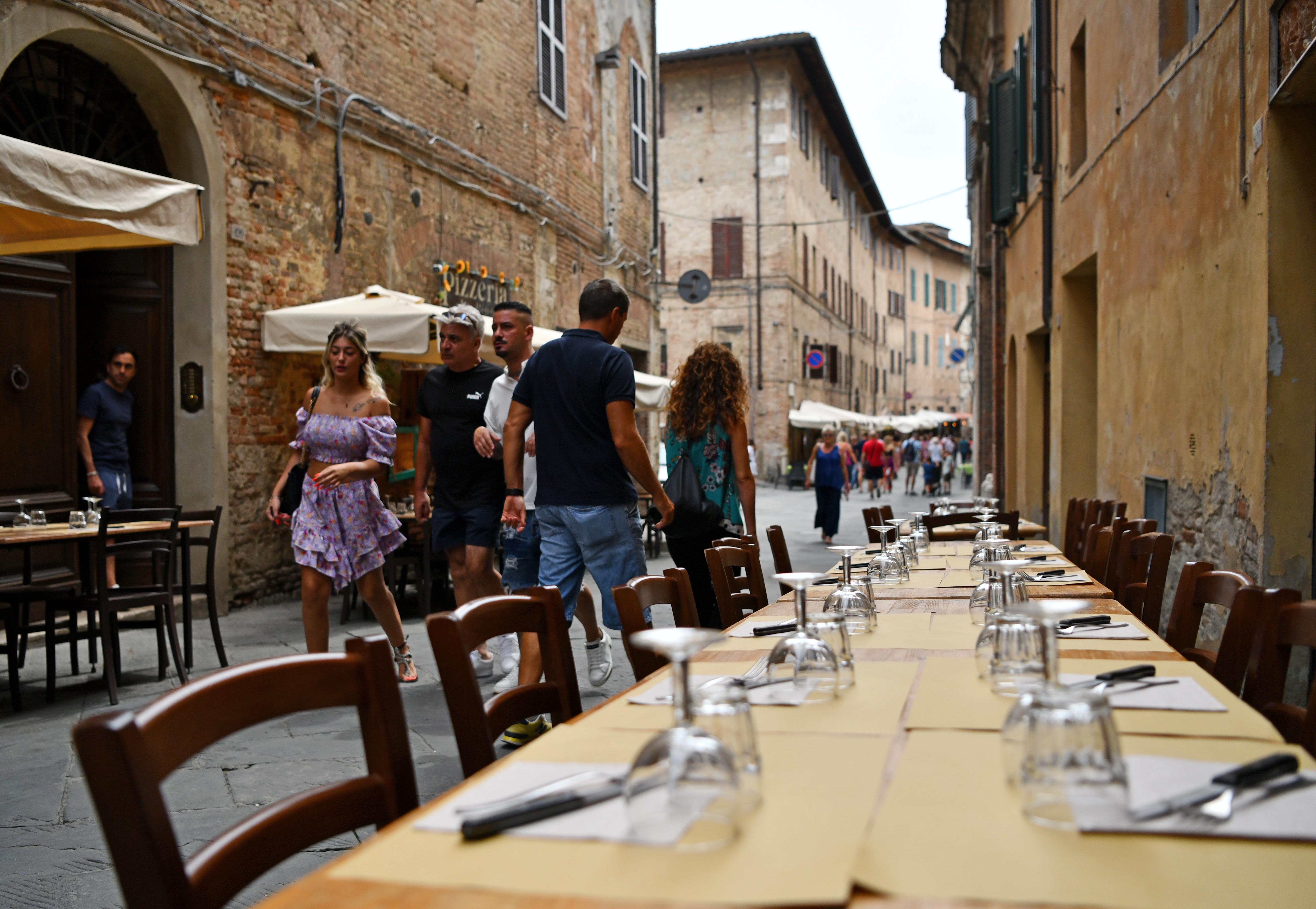 8月15日,游客們?cè)谝獯罄a耶納街頭行走。