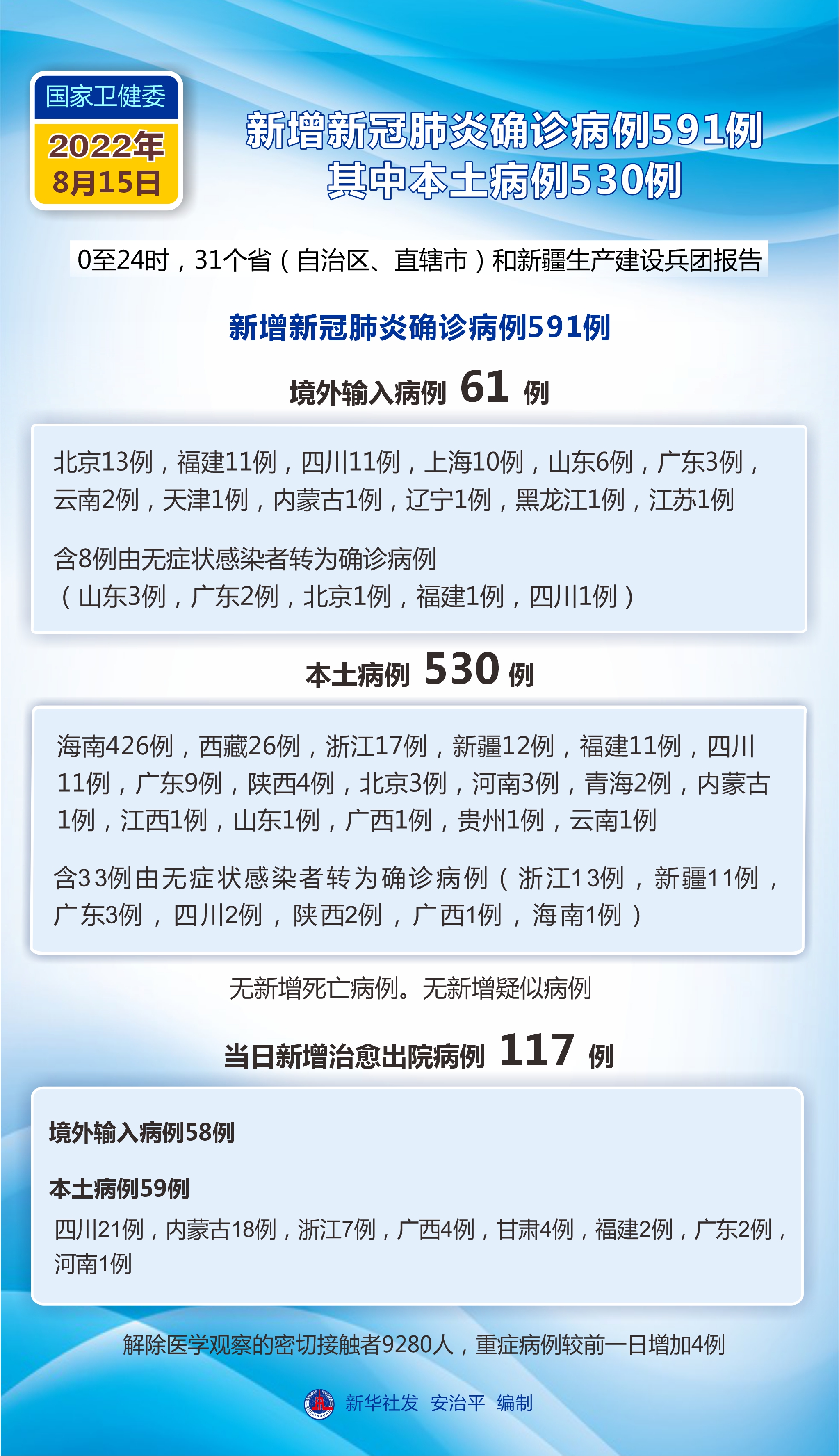 國家衛(wèi)生健康委員會(huì)8月16日通報(bào),8月15日0至24時(shí),31個(gè)?。ㄗ灾螀^(qū)、直轄市)和新疆生產(chǎn)建設(shè)兵團(tuán)報(bào)告新增新冠肺炎確診病例591例。