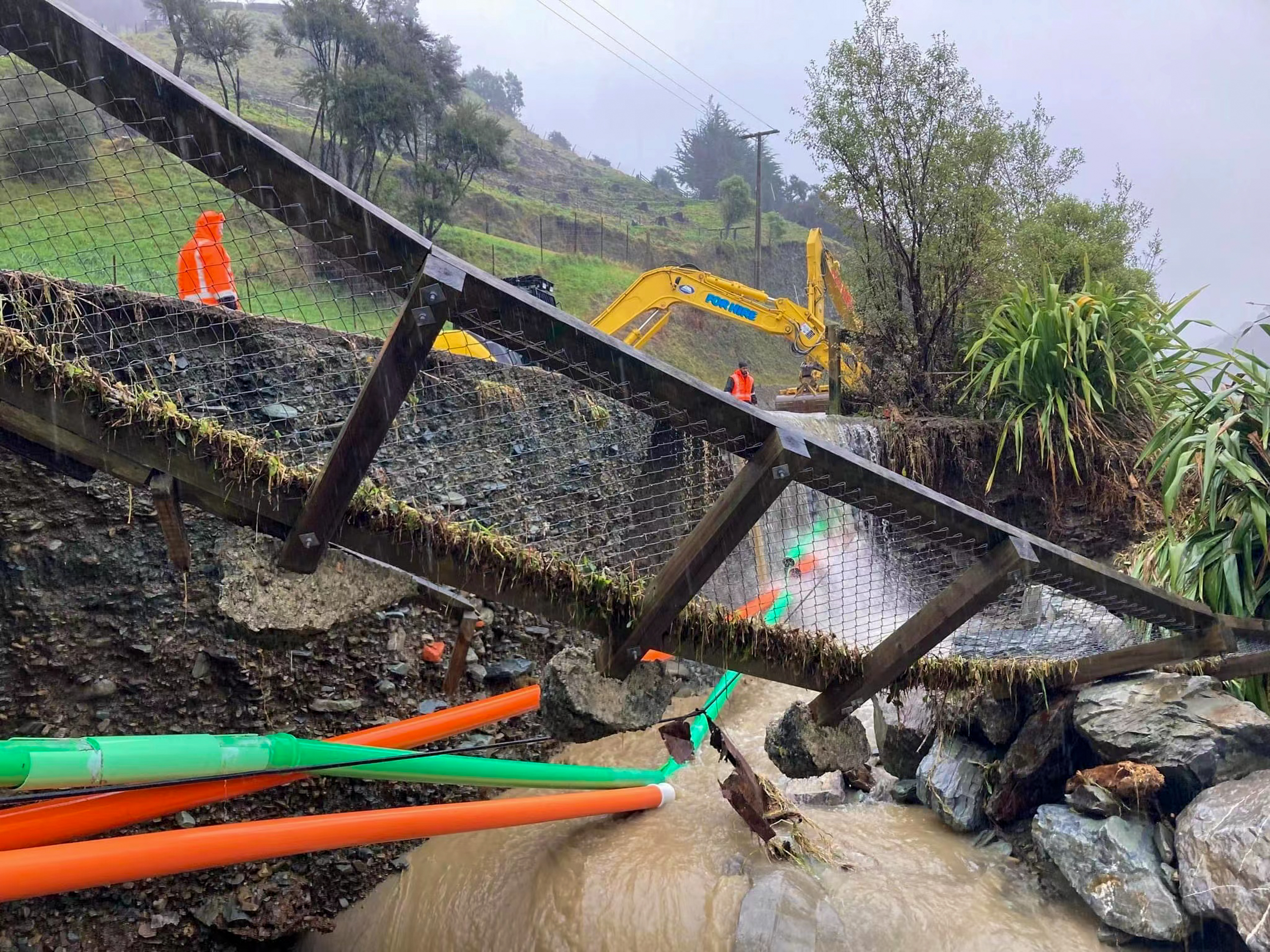 8月18日,在新西蘭南島納爾遜地區(qū),當(dāng)?shù)厥姓ぷ魅藛T檢查路面受洪水損壞的情況。