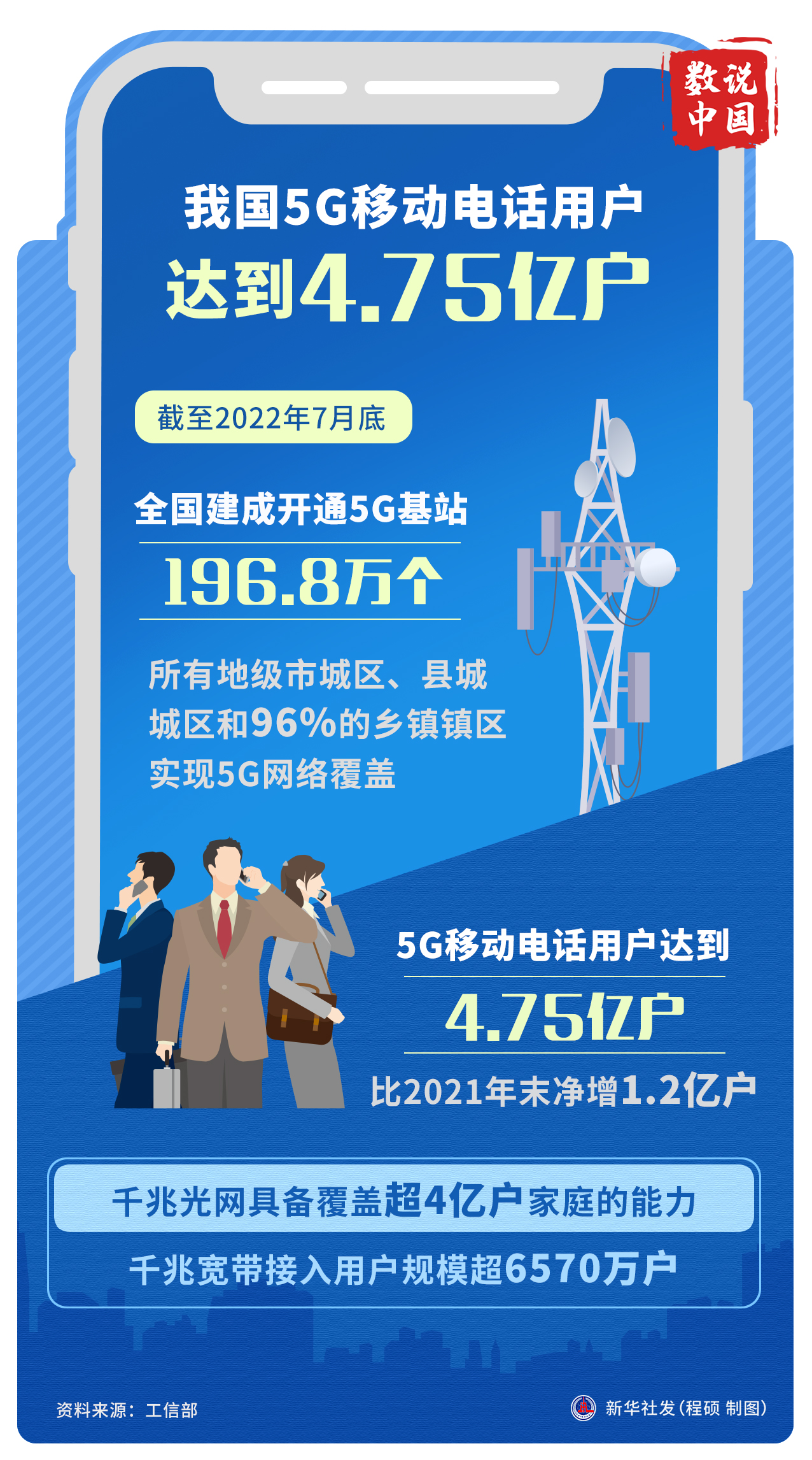 工信部信息通信發(fā)展司司長(zhǎng)謝存8月19日表示,截至7月底,全國(guó)建成開通5G基站196.8萬個(gè),所有地級(jí)市城區(qū)、縣城城區(qū)和96%的鄉(xiāng)鎮(zhèn)鎮(zhèn)區(qū)實(shí)現(xiàn)5G網(wǎng)絡(luò)覆蓋,5G移動(dòng)電話用戶達(dá)到4.75億戶,比2021年末凈增1.2億戶,千兆光網(wǎng)具備覆蓋超4億戶家庭的能力,千兆寬帶接入用戶規(guī)模超6570萬戶。