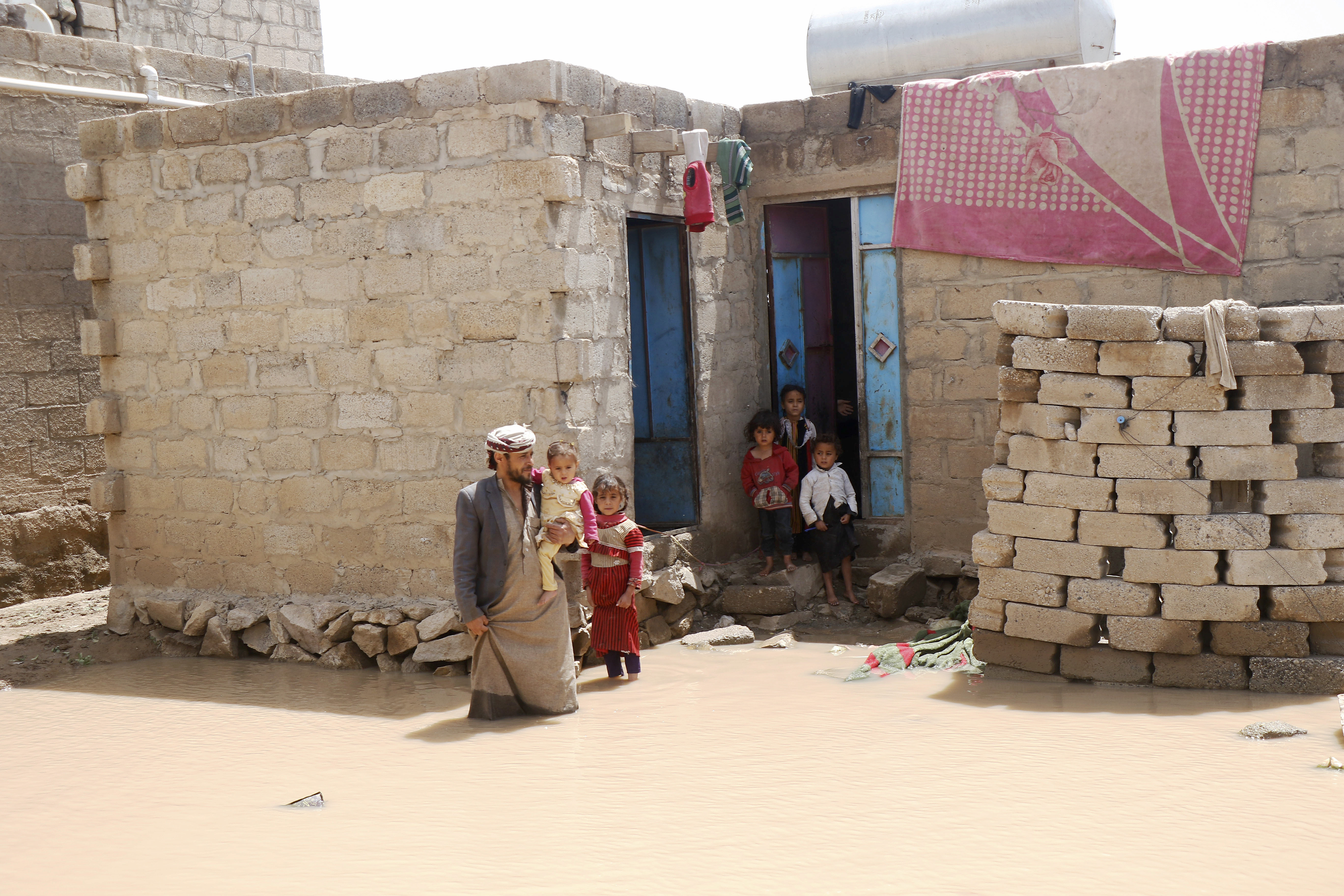 8月23日,在也門扎馬爾省馬巴爾地區(qū),一名男子與孩子站在被洪水侵襲的房屋前。