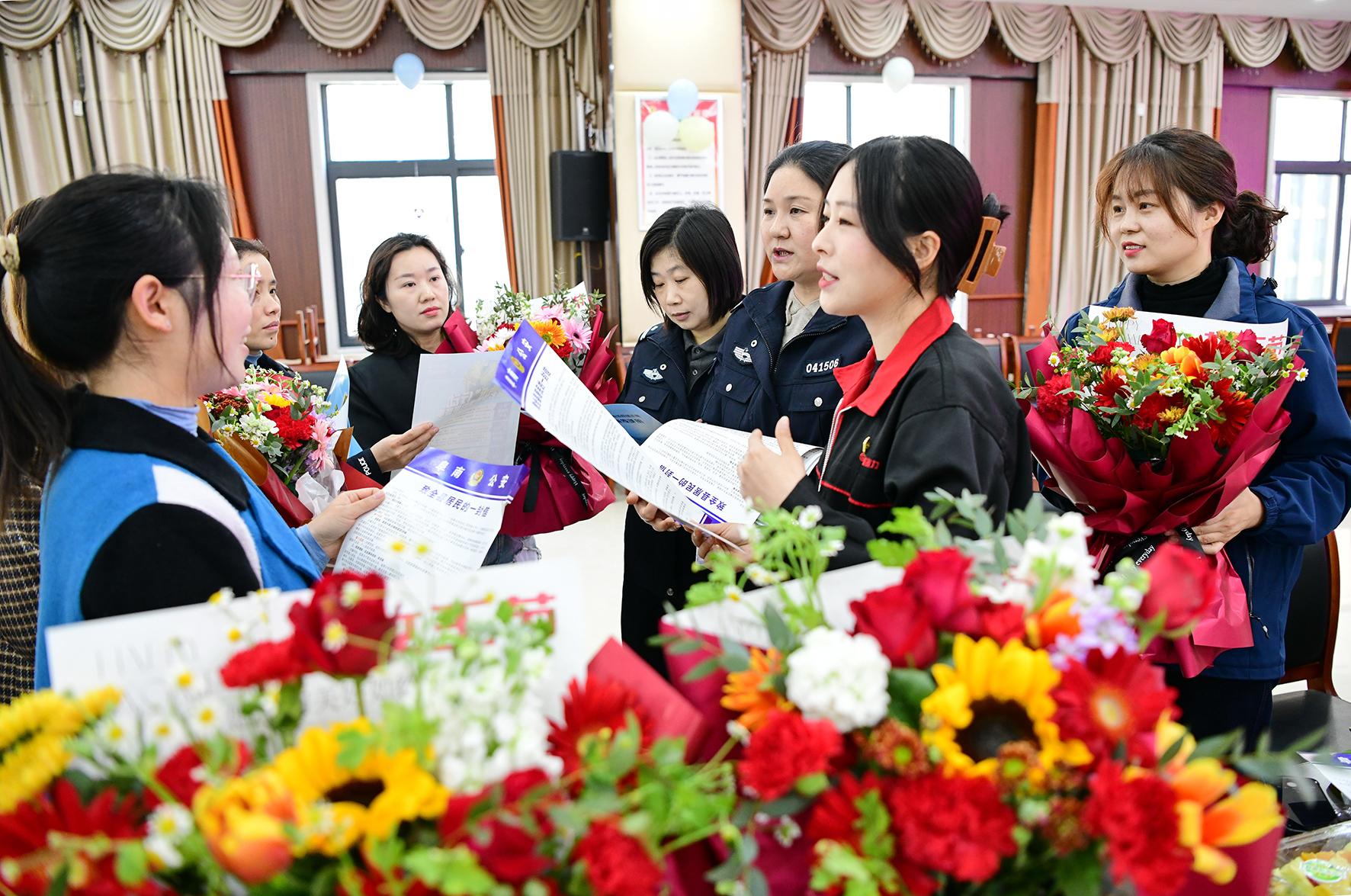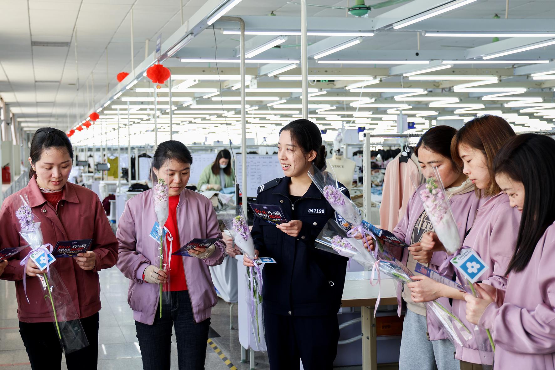 3月7日,浙江省嘉興市公安局南湖區(qū)分局七星派出所女民警走進(jìn)轄區(qū)企業(yè),為女員工們送上帶有反詐小貼紙的“三八”節(jié)祝福鮮花。