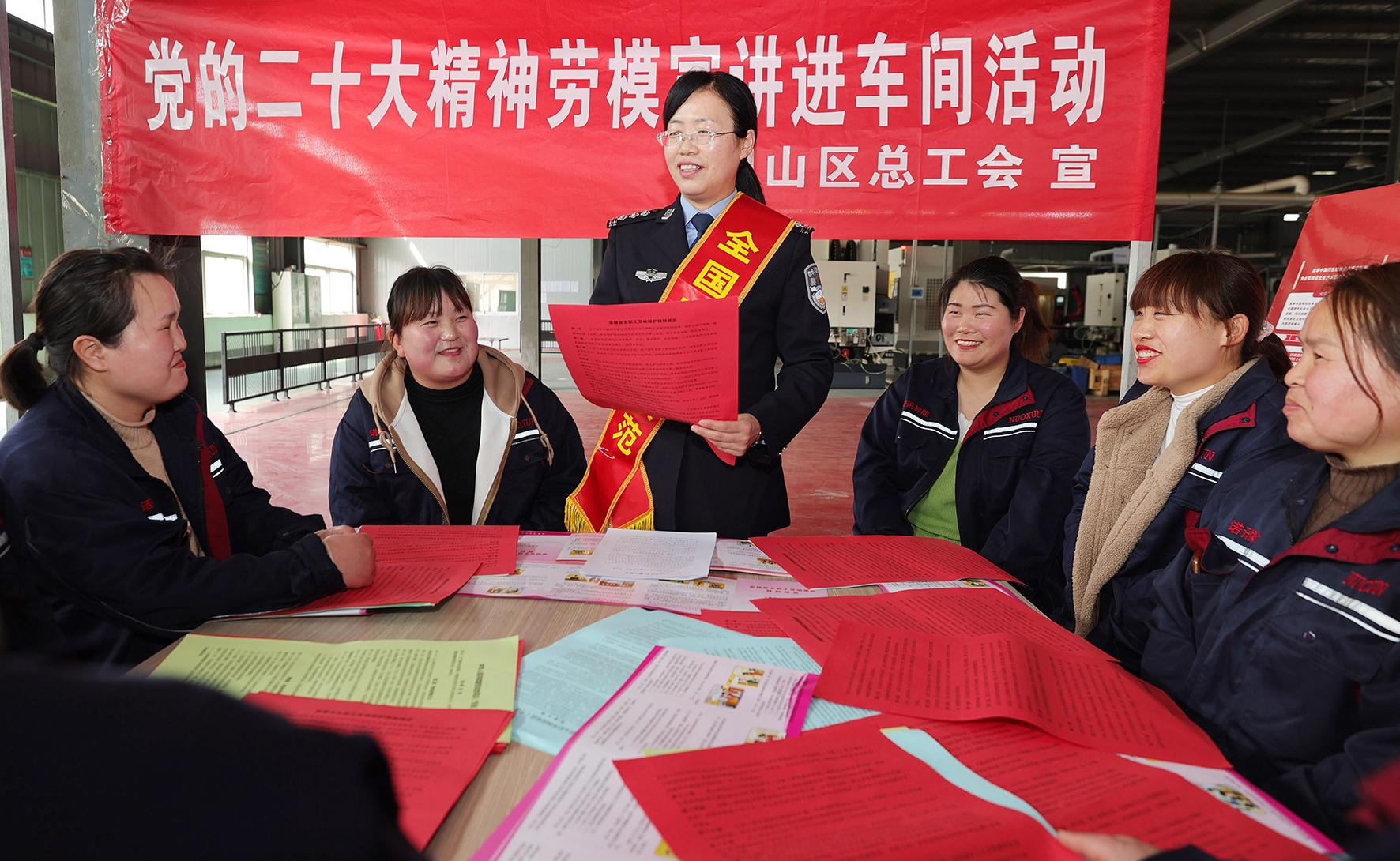 3月7日,安徽省淮北市相山經(jīng)濟(jì)開發(fā)區(qū)企業(yè)生產(chǎn)車間,全國勞動模范、淮北市公安局三堤口派出所所長王懷芬為一線女職工講述立足崗位作貢獻(xiàn)的奮斗故事。