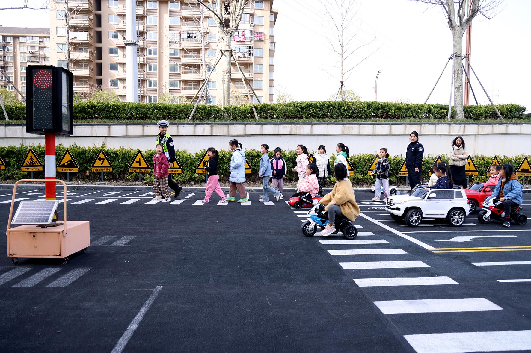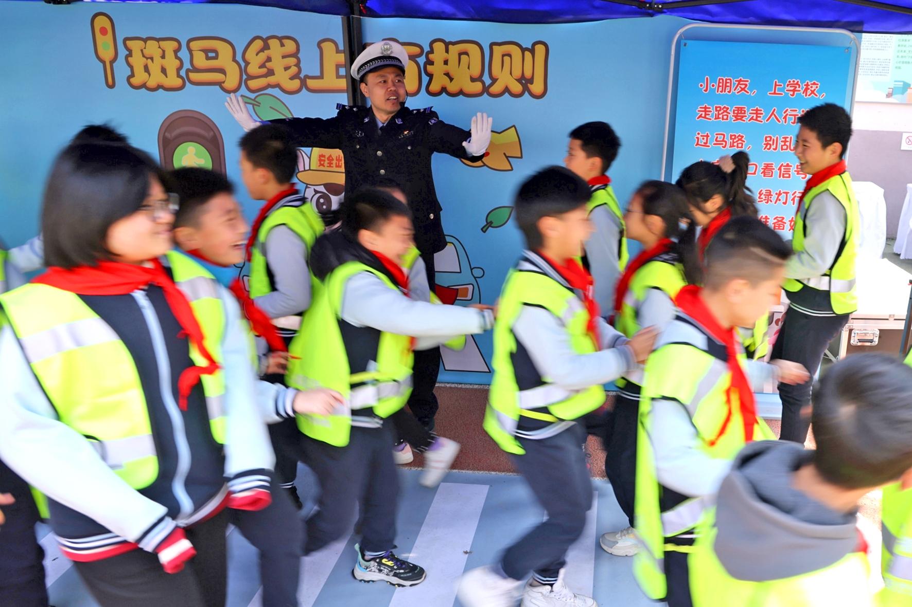 圖為民警帶學(xué)生沉浸式模擬體驗安全通過十字路口。
