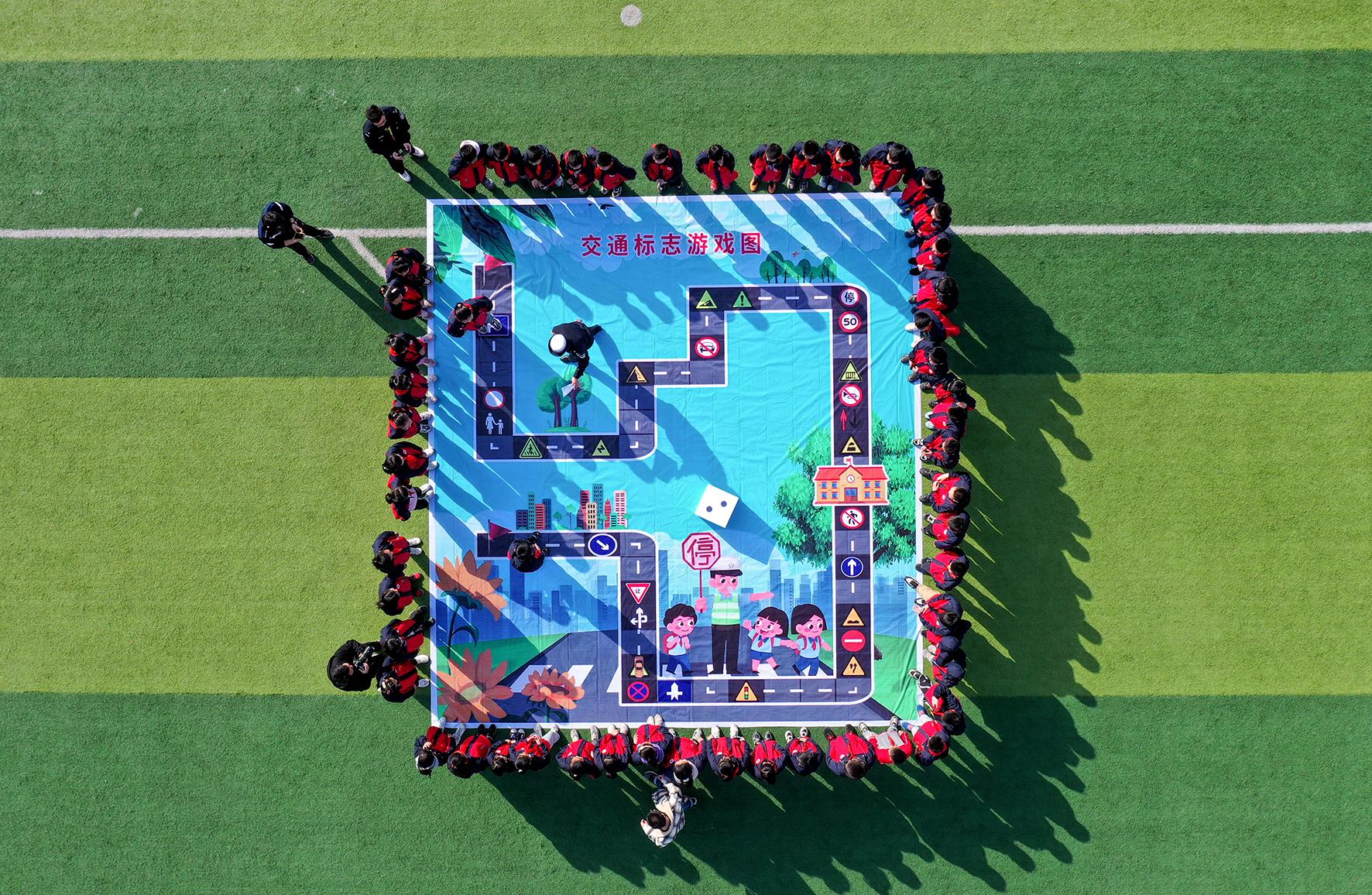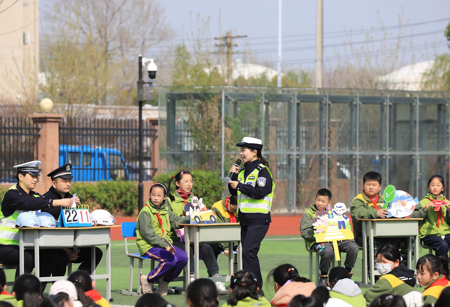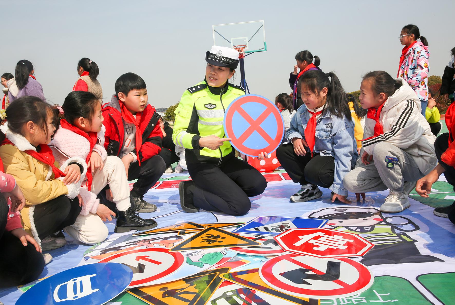 3月26日,安徽省阜南縣公安局交管大隊民警在黃崗鎮(zhèn)靳成學(xué)校與學(xué)生們互動交通安全知識。