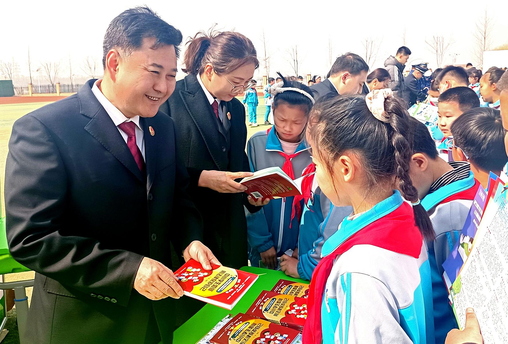 圖為檢察官向李哥莊鎮(zhèn)小學(xué)學(xué)生贈送《中小學(xué)生如何用法律保護自己》書籍。