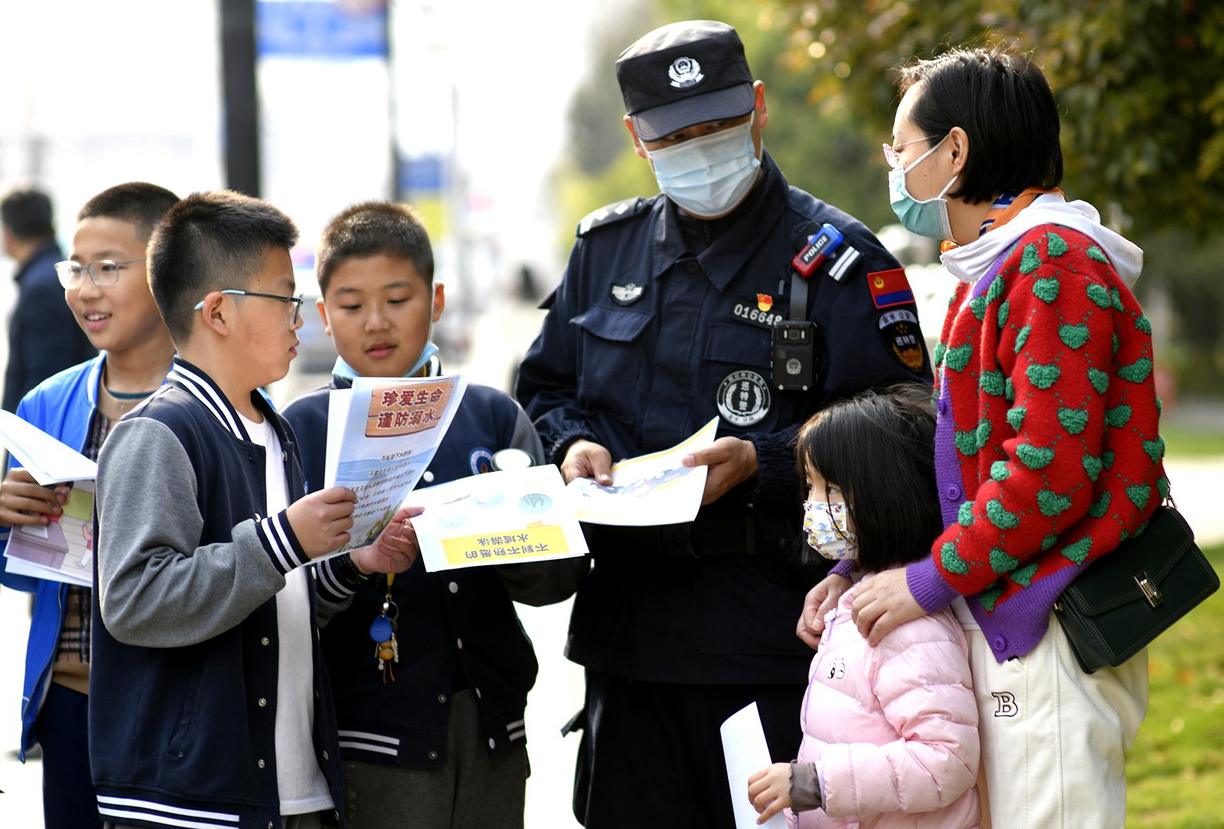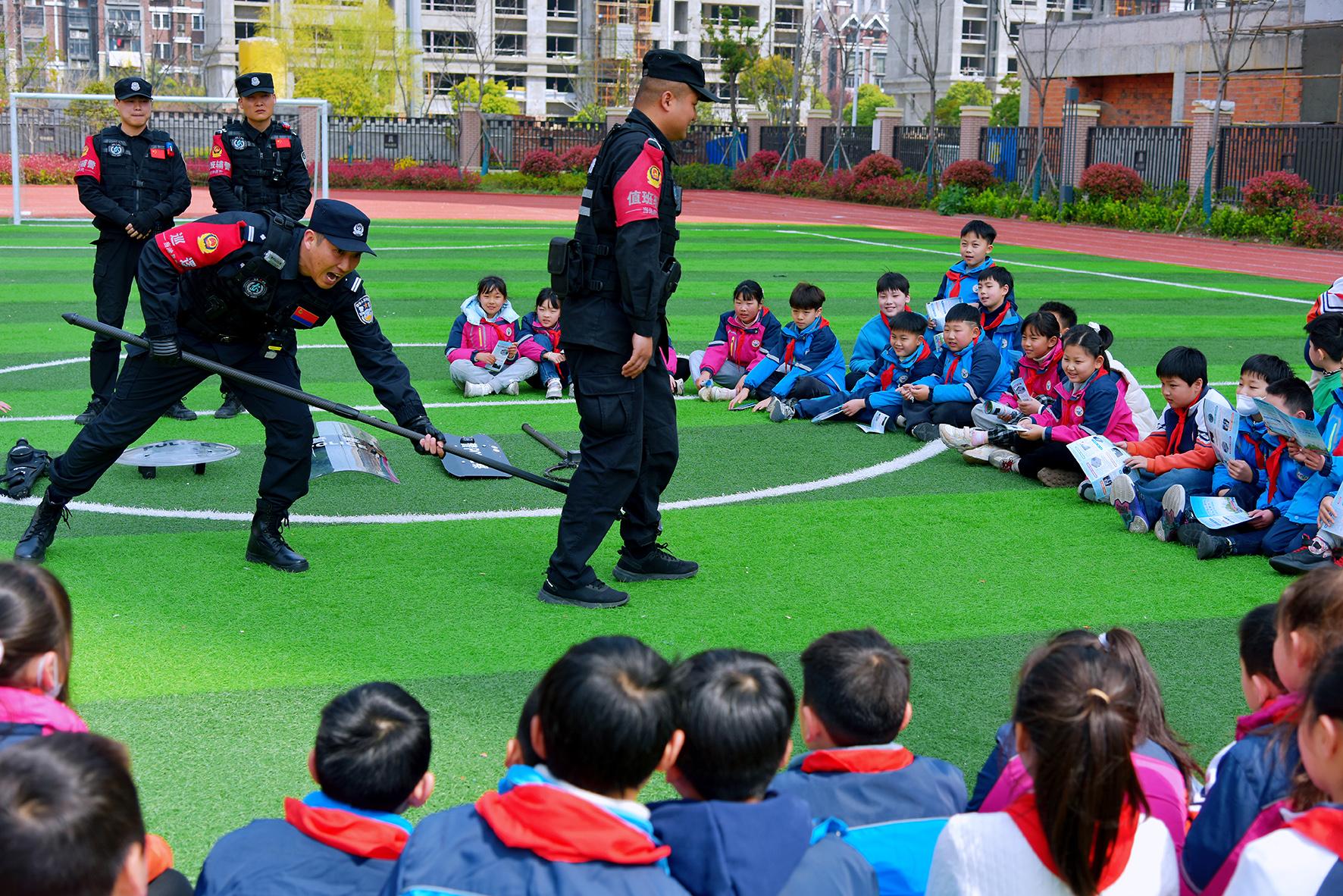 3月26日,河南省鄭州市公安局金水分局巡特警隊員在街頭開展“中小學(xué)生安全教育”活動。