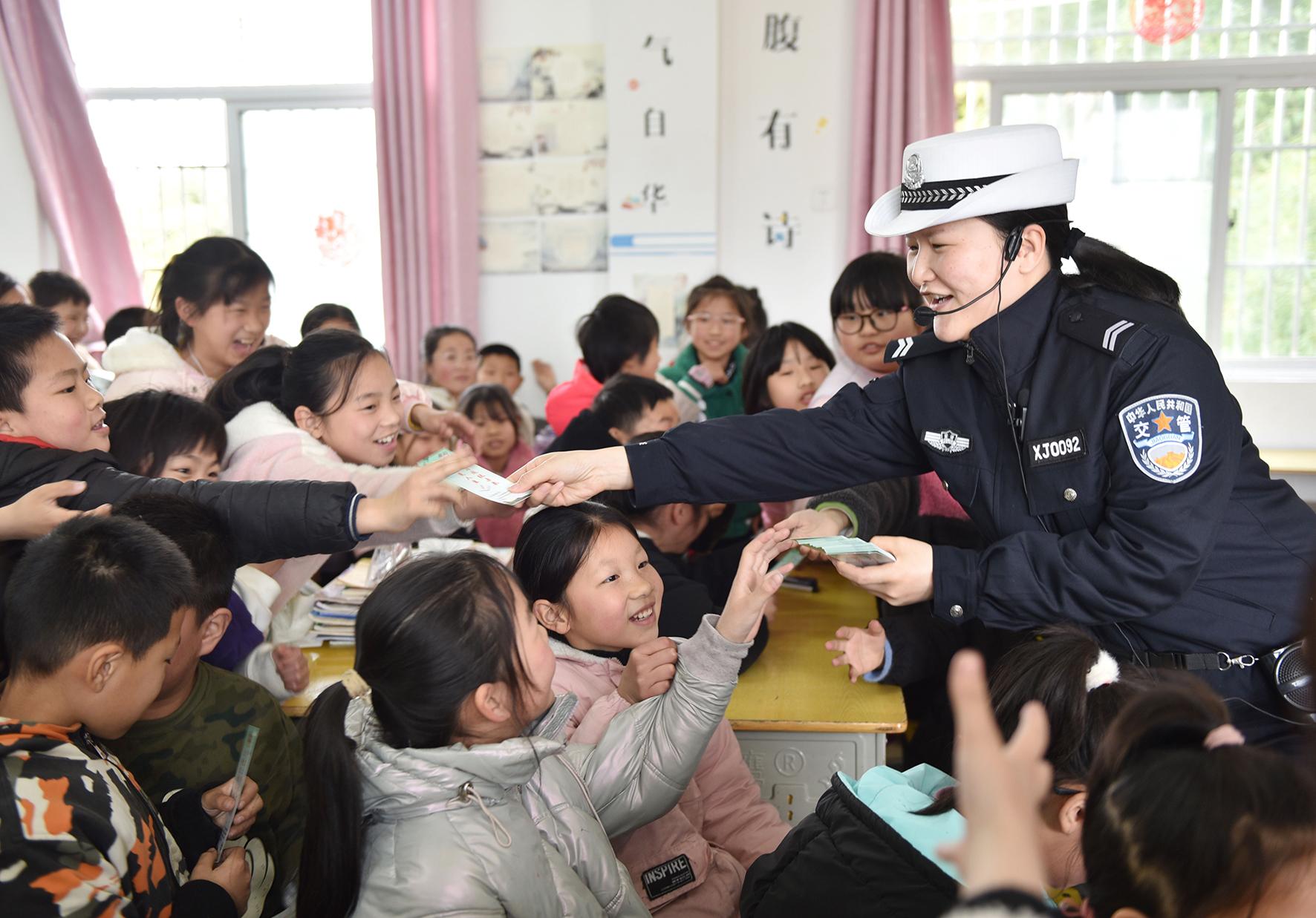 3月24日,安徽省宿松縣公安局交警大隊民輔警將自主設(shè)計制作的20000份交通安全書簽送到農(nóng)村學(xué)校學(xué)生手中。