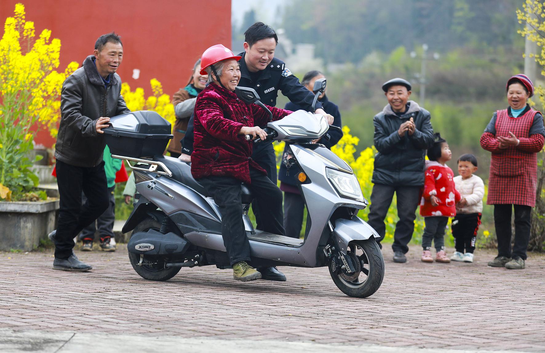 3月26日,貴州省黔西市公安局金蘭派出所民警在清華村院壩里,指導(dǎo)村民練習(xí)騎車技術(shù),講解道路交通安全知識。