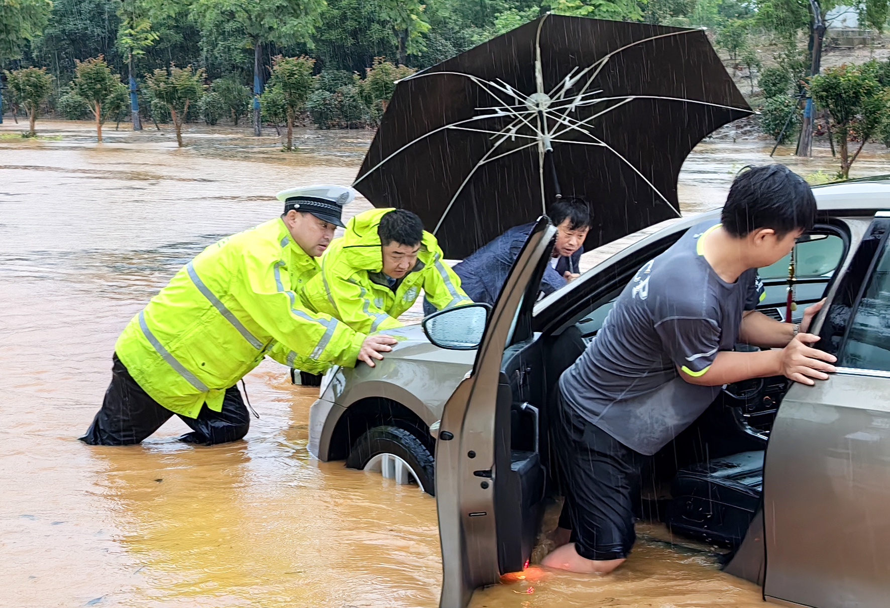 5月27日,安徽省安慶市公安局交警支隊(duì)五大隊(duì)民警在經(jīng)開(kāi)區(qū)天柱山東路段對(duì)被困積水中的車輛實(shí)施救援。