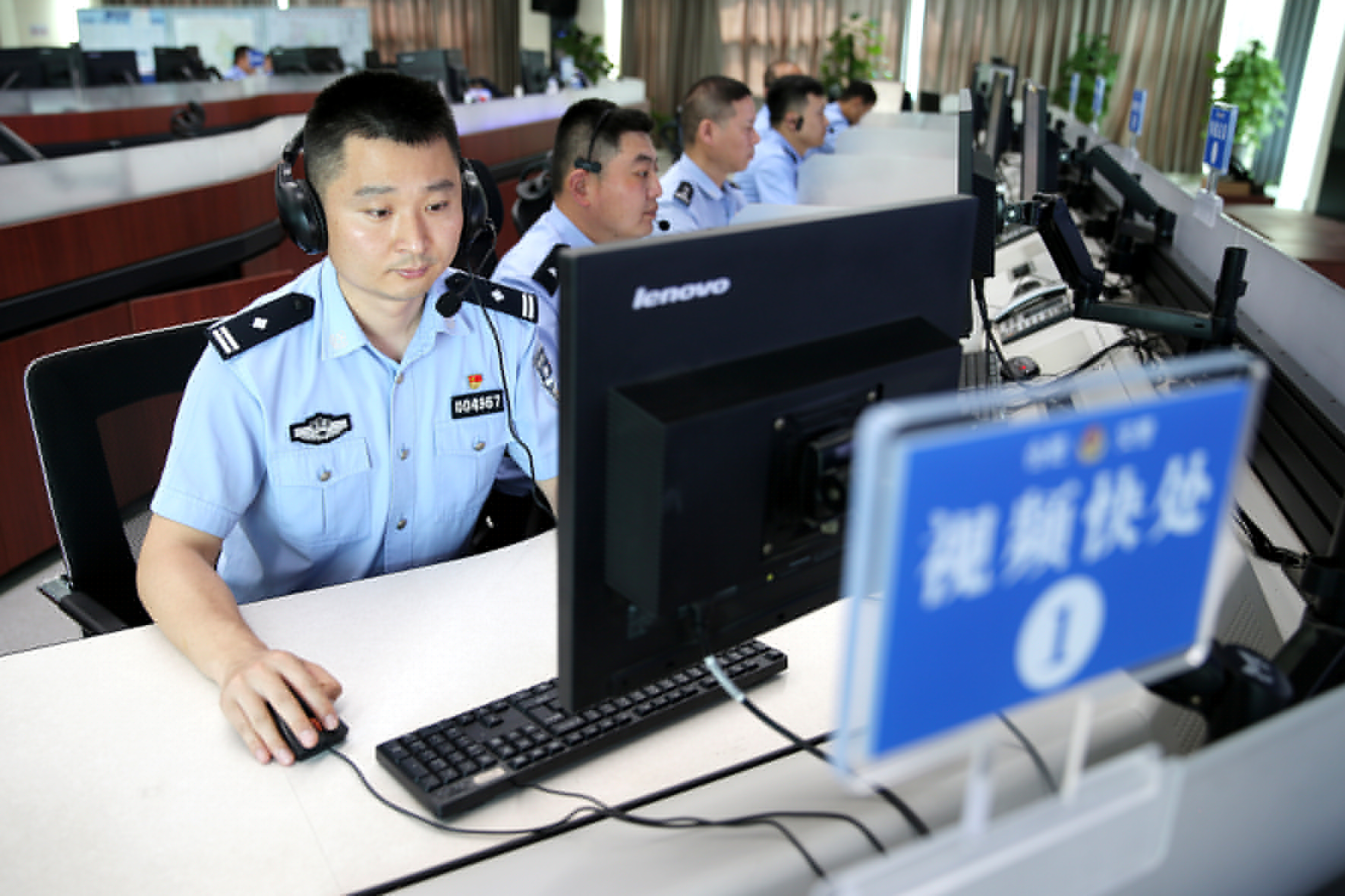 圖為6月2日,合肥市公安局交警支隊輕微道路交通事故視頻快處遠程接警后臺民警正在進行信息采集等工作。