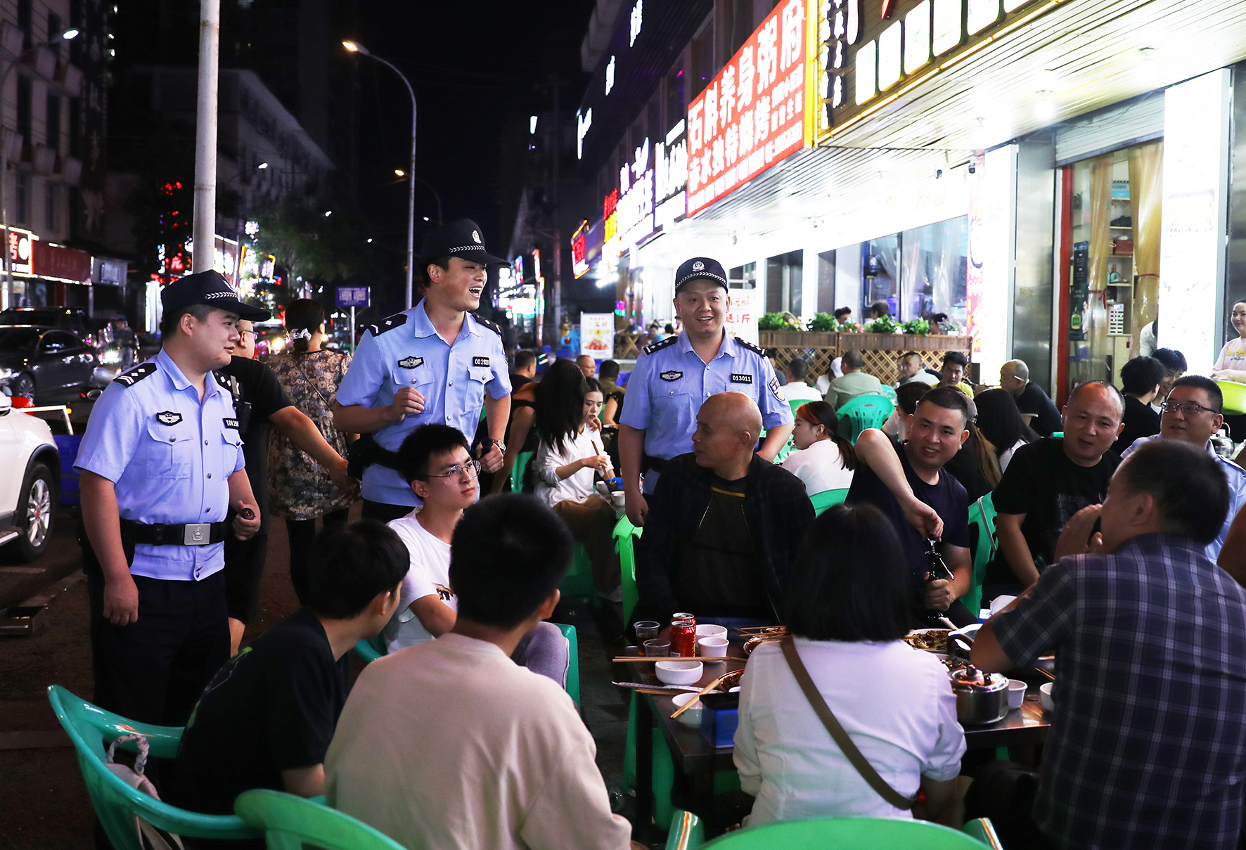 6月5日晚,貴州省赤水市公安局文華派出所民警在燒烤攤點提示市民共同營造良好的高考氛圍。