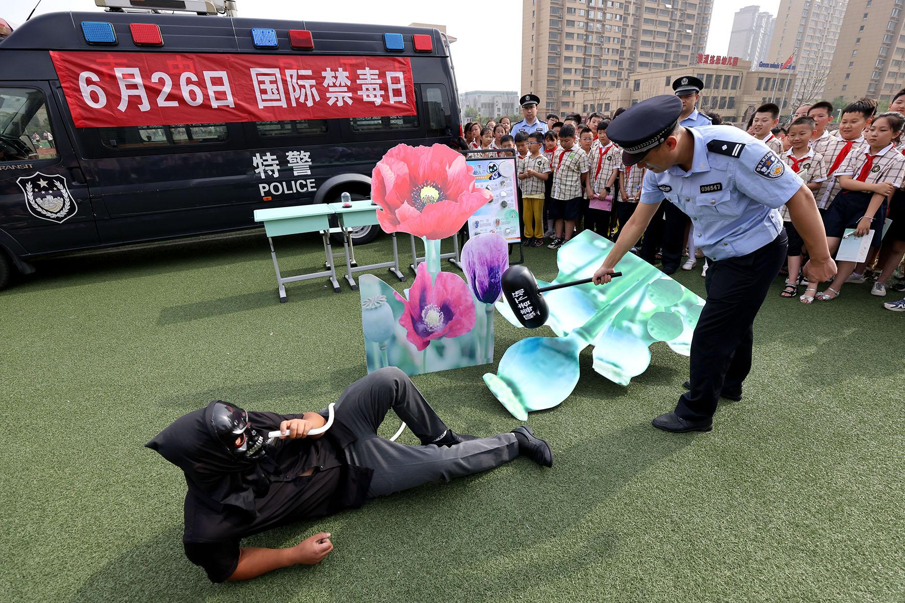 6月21日,山東省棗莊市公安局市中分局民警在東湖小學(xué)給學(xué)生們表演自編的情景劇“吸毒者下場(chǎng)”。在國(guó)際禁毒日來臨之際,棗莊市公安局市中分局圍繞“健康人生、綠色無毒”的宣傳主題,組織民警走進(jìn)校園開展禁毒宣傳教育活動(dòng),通過多種形式讓學(xué)生們了解毒品危害,從小培養(yǎng)他們的識(shí)毒、防毒、拒毒意識(shí)。