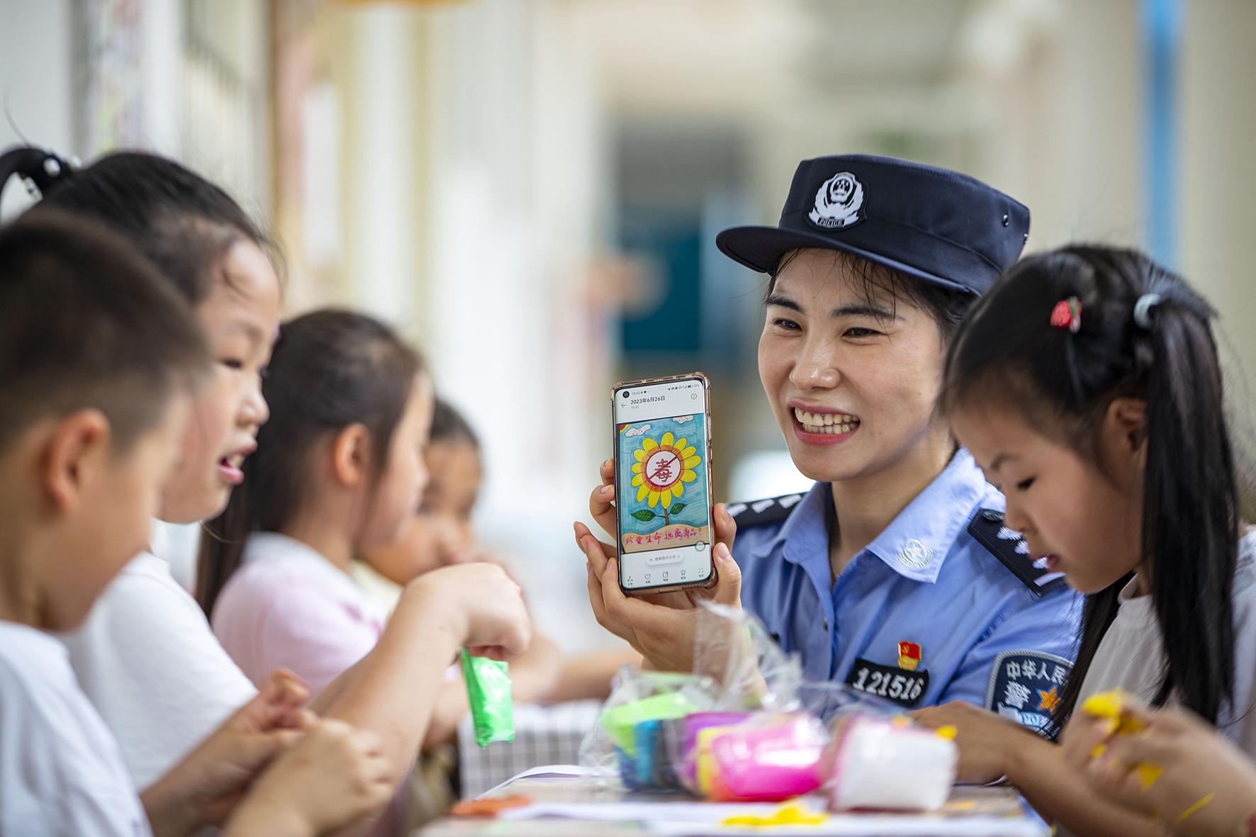 6月26日,江蘇省泰州市公安局海陵分局九龍派出所民警在幼兒園指導小朋友進行“童心畫禁毒”活動。