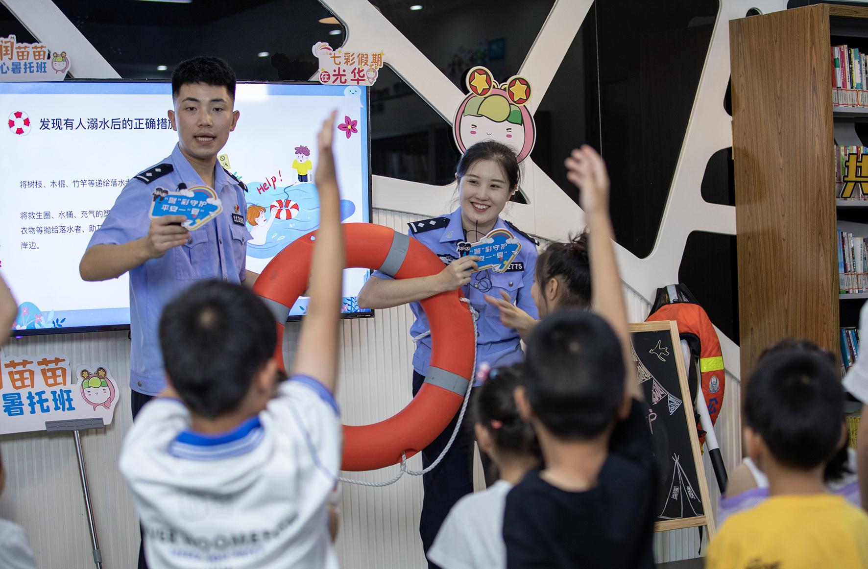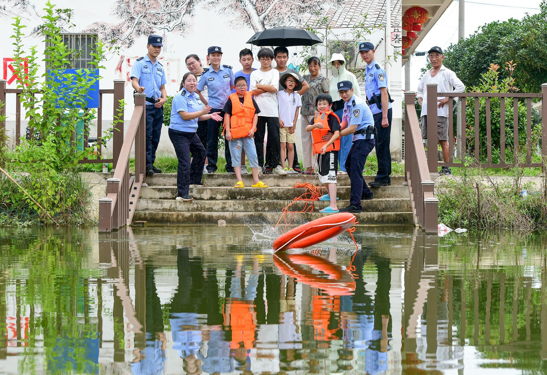 7月6日,安徽省馬鞍山市和縣公安局石楊派出所民警正在石楊鎮(zhèn)幸福村向留守兒童講解暑期防溺水知識(shí),以提高他們知危險(xiǎn)、會(huì)避險(xiǎn)的意識(shí)和自我保護(hù)能力。