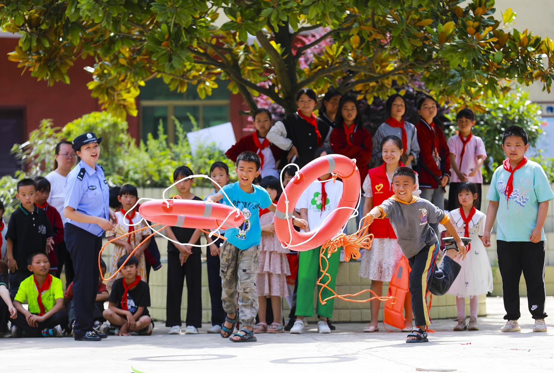 7月7日,在貴州省黔西市雨朵鎮(zhèn)沈場(chǎng)小學(xué),民警指導(dǎo)學(xué)生學(xué)習(xí)使用救生圈。暑假臨近,黔西市公安局雨朵派出所民警到轄區(qū)各所學(xué)校開展防溺水安全教育主題活動(dòng)。