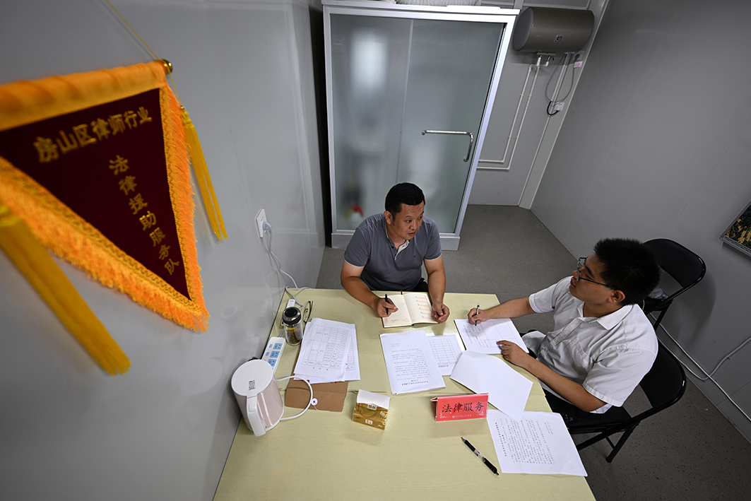 安置點(diǎn)司法工作室,房山司法局基層科科長及識宇(左)與值班律師盤點(diǎn)工作重點(diǎn)。