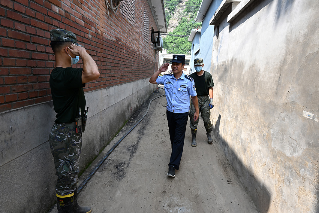 在一片忙碌中,“警察藍(lán)”格外顯眼。這一天,受災(zāi)被淹的十渡鎮(zhèn)派出所終于搬入了條件好一些的臨時辦公點(diǎn),民警們也換上了剛剛從派出所“搶救”出來的警服,開啟了常規(guī)工作模式。