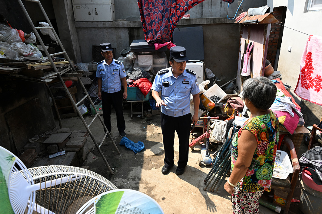 社區(qū)民警張宗雷(中)和張春江(左一)第一時間到受災(zāi)村民家中了解情況。