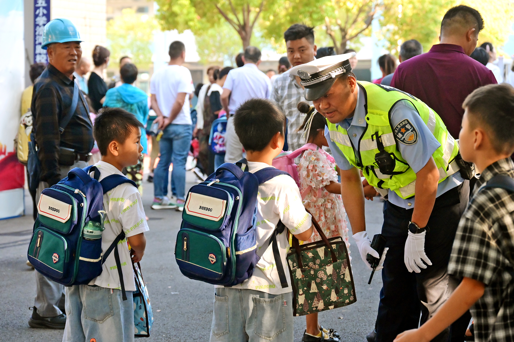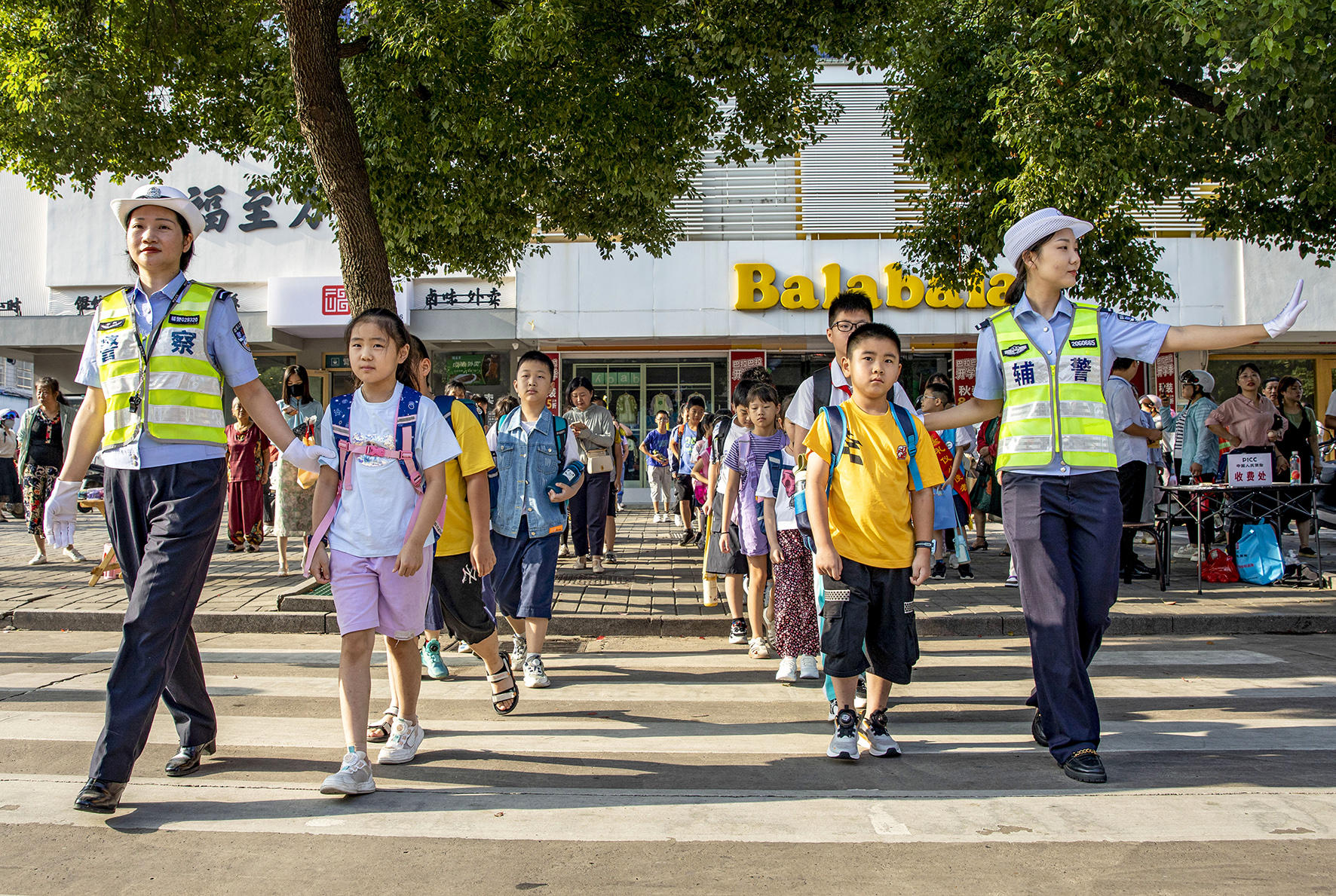 9月1日,安徽省蕪湖市公安局交警支隊弋江大隊女子護學崗民警輔警,在安徽師范大學附屬小學路段指揮疏導交通,守護學生平安。