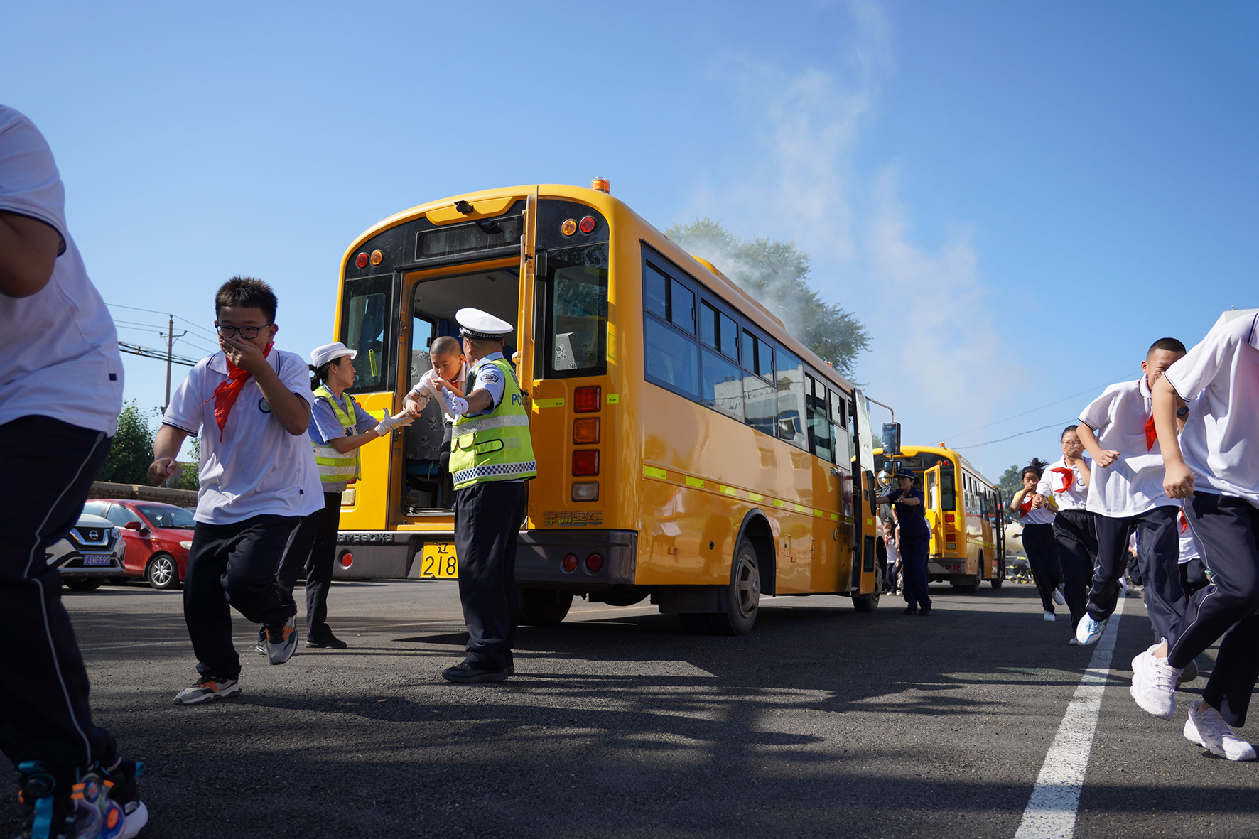 9月1日,開學第一天。遼寧省阜新市公安局交警支隊太平大隊聯合太平區(qū)消防大隊走進阜新市城南小學開展“知危險 會避險”校車自燃事故應急演練活動。