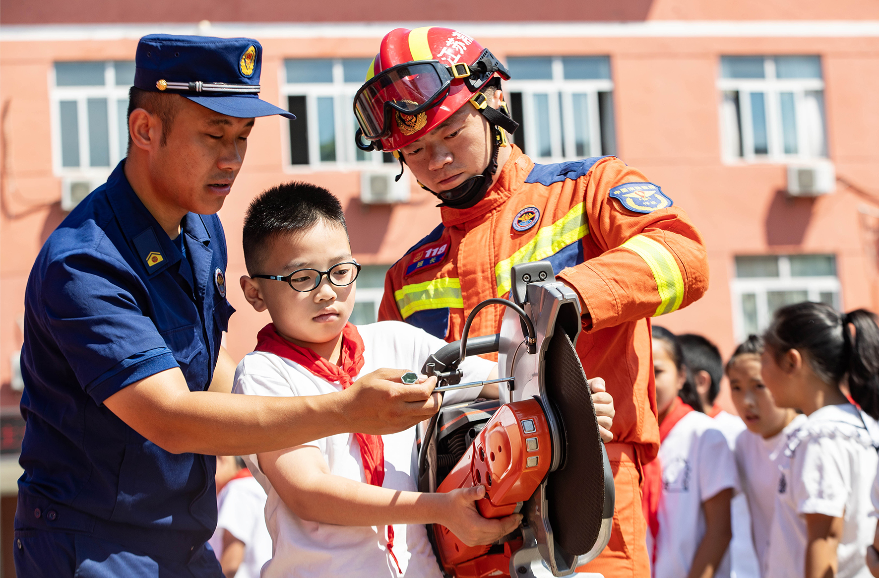 圖為消防救援隊員在克強學校指導學生使用消防救援設備。
