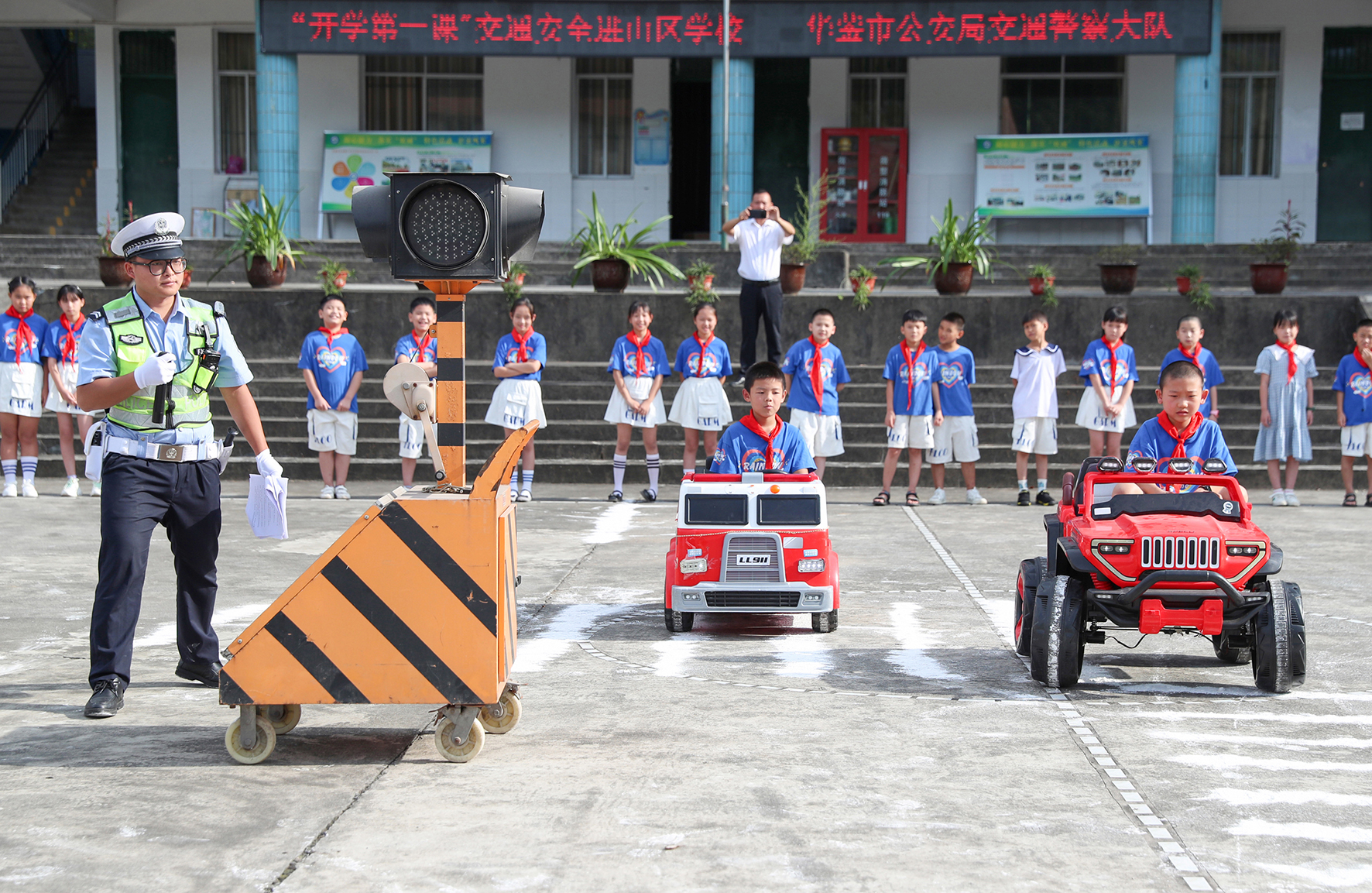 9月1日, 四川省華鎣市公安局交通警察大隊組織民警, 攜帶紅綠燈具、模型車、交通安全標識牌等來到天池鎮(zhèn)小學,開展體驗式交通安全教育。