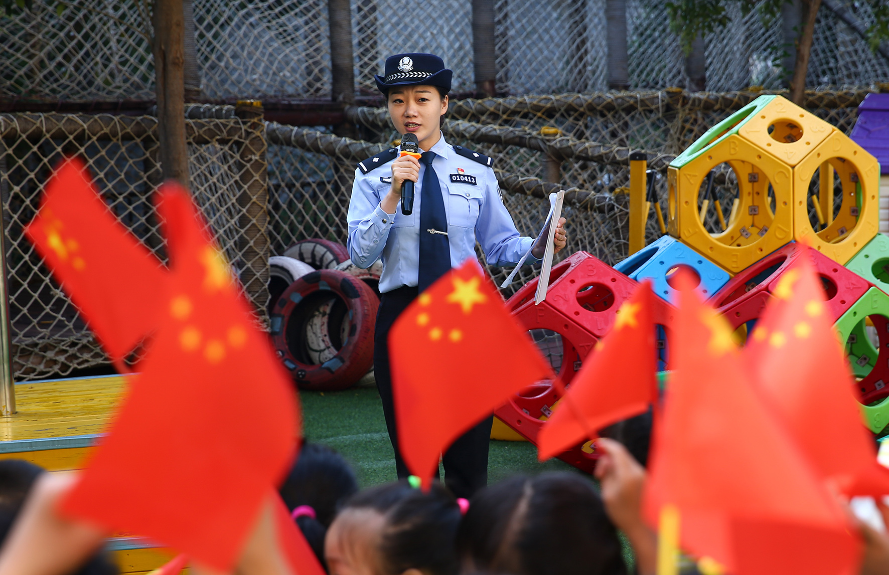 9月28日,山東省濟(jì)南市公安局市中區(qū)分局民警來到幼兒園開展愛國(guó)主義教育,喜迎國(guó)慶節(jié)。