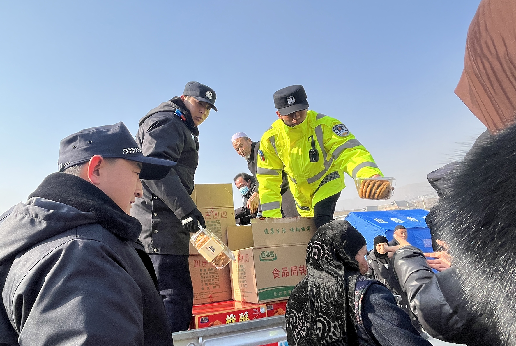 12月20日,甘肅省永靖縣公安局民輔警在積石山縣大河家臨時(shí)安置點(diǎn),按照抗震救災(zāi)指令要求,開展社會(huì)面管控、秩序維護(hù)、分發(fā)物資、搭建帳篷等工作,全力投入抗震救災(zāi)第一線。