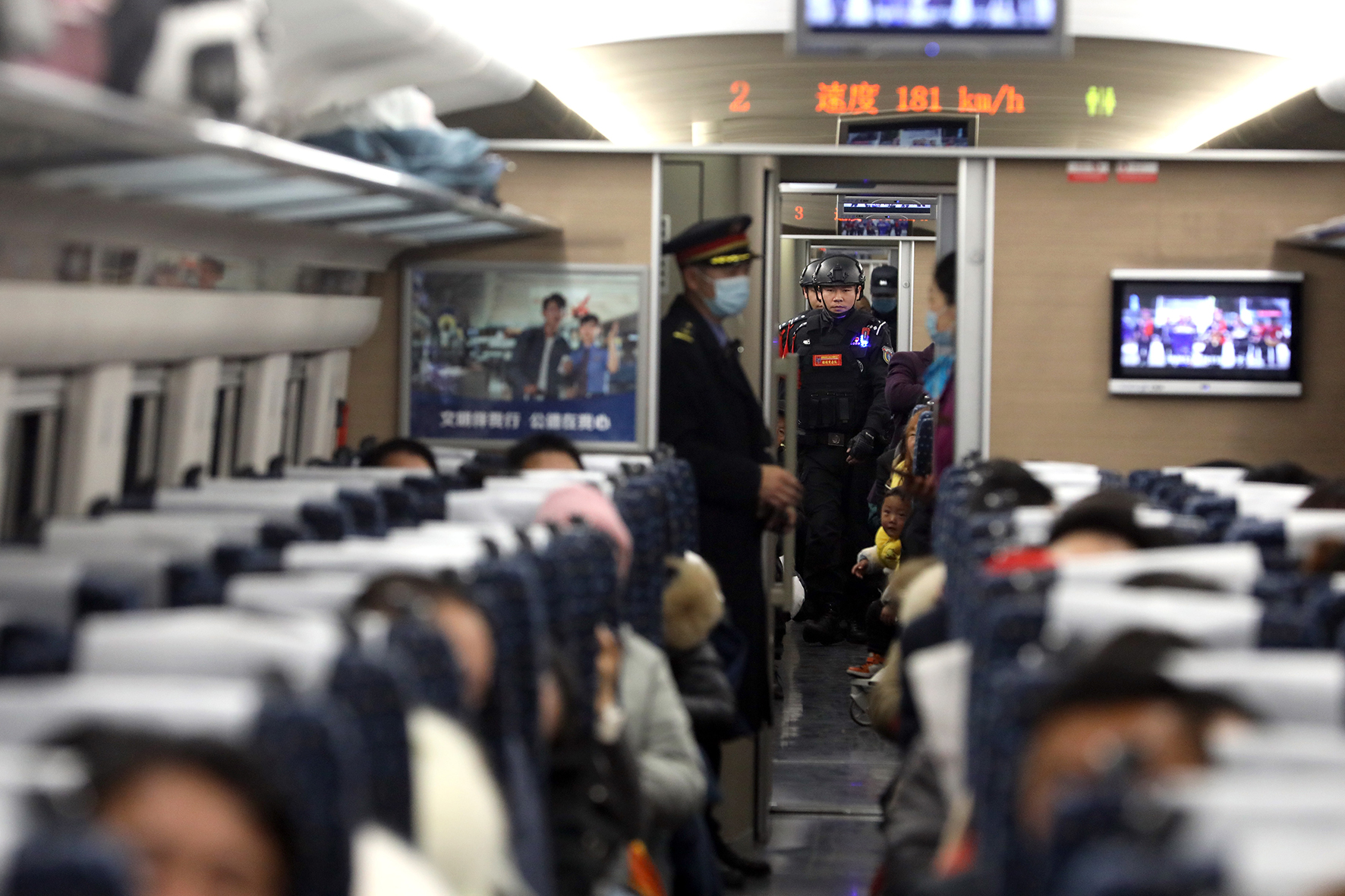 12月29日,在成都東開往茂縣的C6006次動(dòng)車組列車上,一隊(duì)警容嚴(yán)整、精神飽滿的特警隊(duì)員格外引人注目,他們是成都鐵路公安處特警支隊(duì)民警,為旅客安全出行護(hù)航。