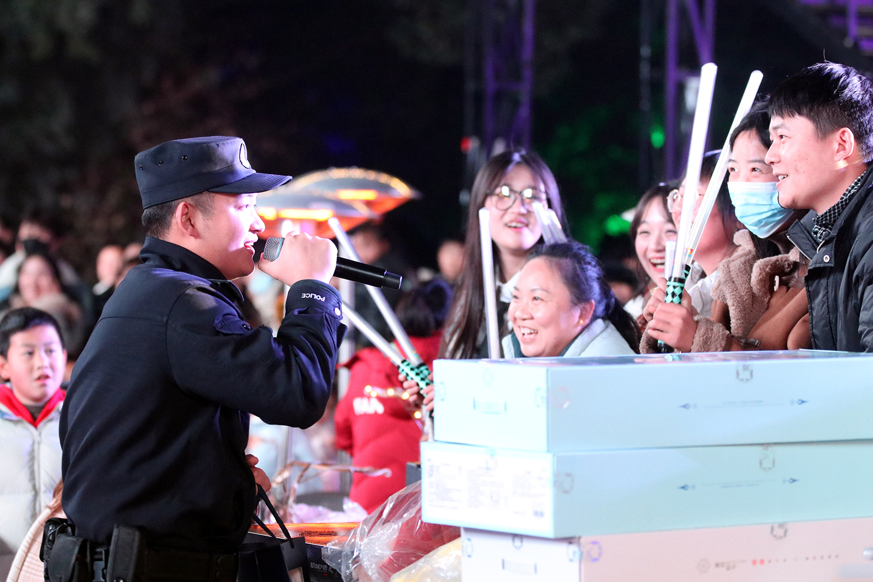 2023年12月31日,安徽省蕪湖市方特景區(qū)舉行大型跨年夜慶?;顒印J徍泄簿置窬F(xiàn)場與游客互動,宣傳反詐、交通等安全知識。