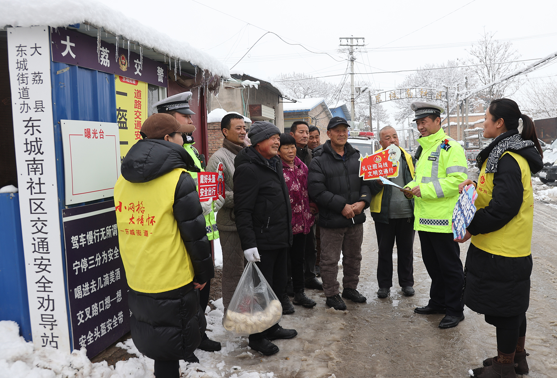 1月17日,在陜西大荔縣東城街道東城南社區(qū)的交通安全勸導站,民警與社區(qū)干部在勸導群眾大雪過后應注意交通安全。